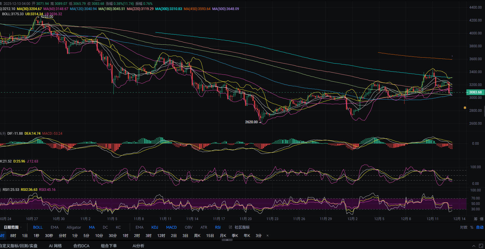 想必粉丝了们都有跟上空单吧,在最近的几波反弹中历辉都精准的预判到了高位压力,并给到空头入场点,昨日文章分析中给到在4小时中轨与MA15交叉压力下可以果断入场,这不下来又是将近200点空间;继续来看以太坊4小时级别布林地再次开口,注意是开口,不是向下收口,说明上方空间还是存在的,但中轨和下轨还在下移,表明短线高点压力还在下调,包括下方也还存破位可能,可以清楚的看到下轨正在下穿MA180与MA120交叉支撑节点,这个现象和昨日下轨下穿MA220与MA60剧情一模一样,昨日我就说了破了3100就还要走跌,现在k线也是继续考验MA180与MA120交叉节点能否二次支撑,守不住这个位置相当于破了日线中轨就还要继续走空到日线下轨2940位置附近;从形态上来看短期是没有问题的,虽然行情止跌,但MACD中没有缩量,快慢线死叉后二次背离,这是较强的空头信号,这个在历辉以往的分析中经常见到,是比较好抓的!那么日线就继续看短线反弹到中轨和MA30与MA15交叉压力区间考虑空头入场,已经按照昨日历辉布局的空头入场点位可以继续选择减仓持有,预留短线反弹补仓空间!