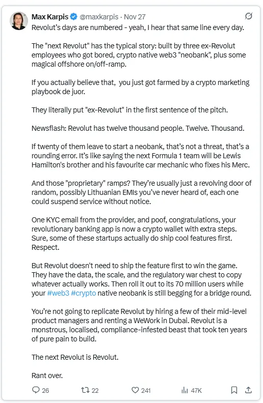 Max Karpis 认为「新型银行」一开始就注定失败,因为它们面临多重结构性障碍:监管和合规成本极高,缺乏规模和用户信任,商业模式依赖第三方且脆弱,资金压力大,盈利困难。相比之下,像 Revolut 这样的巨头拥有庞大的用户基础、数据优势和合规壁垒,可以快速复制创新并凭借规模取胜,因此初创的新型银行很难在竞争中存活或实现颠覆。