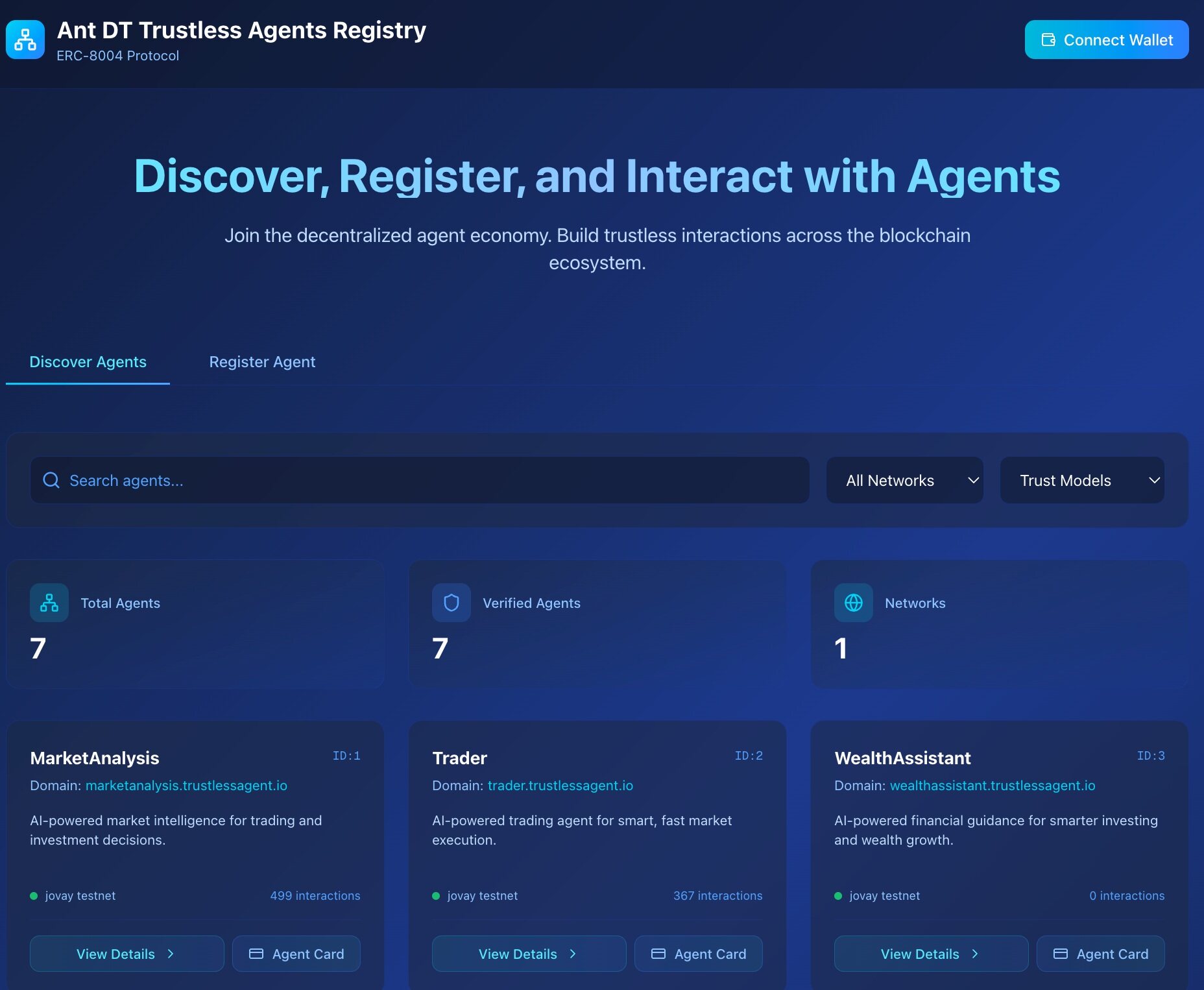 结合 ERC-8004 的设计,我们在 Pharos 和 Jovay 网络构建了面向 Web3 的 Trustless 服务能力,可帮助用户分配 Web3 世界的「可信身份 Agent DID」,同时我们也在原有的基础上进行了金融级增强的 TEE/ZK 验证能力扩展,未来支持如面向机器交易在金融场景的更高安全的验证增强。