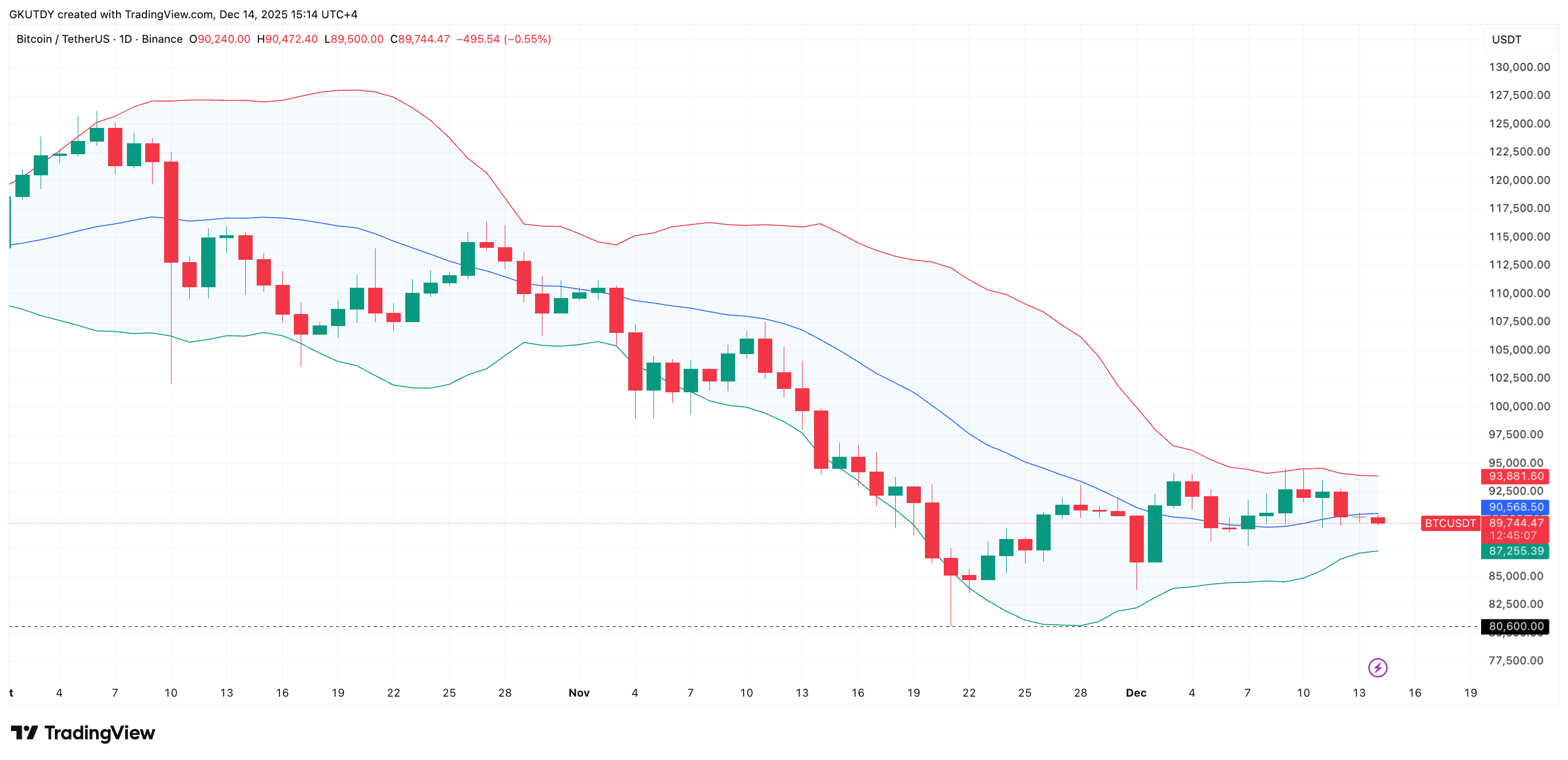 只要每日收盘位于该线之上,价格的自然吸引力就会变成下轨,目前下轨在$87,250——比当前水平下跌近3%。