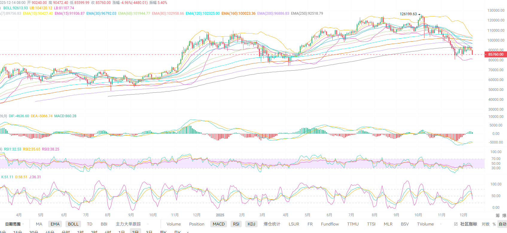 比特币现价85800附近,昨日红姐文稿中再次布局大饼89600上方高空,k线刚好位于4H中轨处承压下行,空势再次被拿捏,跟上的粉丝们目前已拿下将近4000点。红姐昨日说到日线收阴的话那么中轨绝对会成为当日压力,行情也如愿来到了下轨位置,红姐建议高空可以减仓止盈持有,进一步观察1日线DIF与DEA能否形成死叉放量,从KDJ和RSI的形态来看下方空间还是有的,行情处于阴跌节奏,短线反弹可能也没那么快,前面说到既然1日线下轨守不住,那么现在需要下看的位置就是12月1号低点83900上方附近了,从2日图来看是没有问题的,KDJ下行接近35,RSI三线接近30,还未进入超卖,说明下方空间还是有的,思路上红姐依旧建议高空为主,上方可以先关注短线1H中轨与EMA30重合压力位进行空头布局,虽然当前空势较为明显,但红姐不建议低位追空!