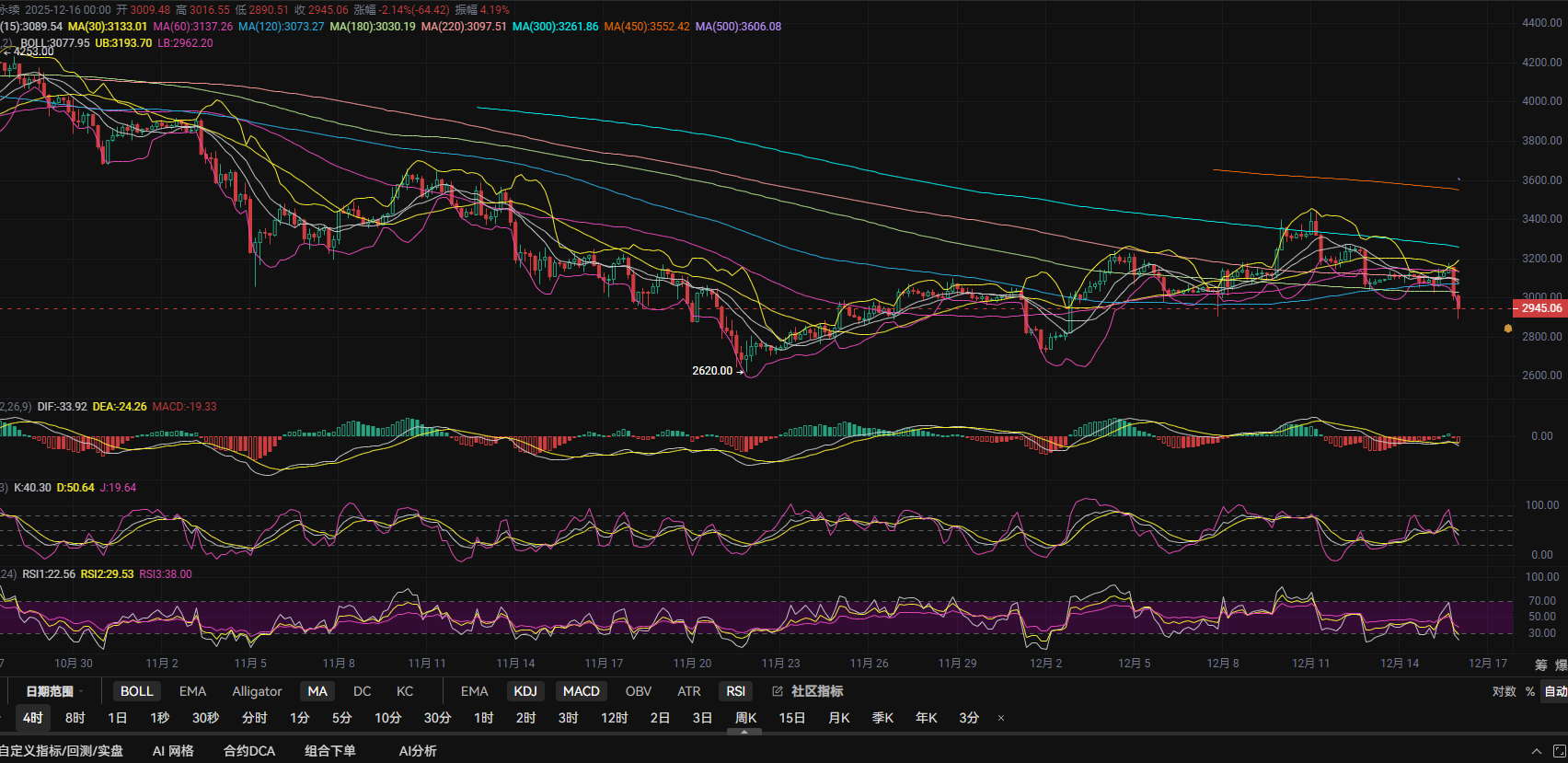 以太坊日内反弹再次触发3140上方高空条件,目标精准触发2930下方,当前已触发止盈减仓,继续等待空头演变!1小时图中行情刚刚下插2900下方形成下影线,KDJ与DEA存在低位超卖拐头现象,有短多反弹需求,所以历辉把这里作为一个止盈点;反弹上方建议关注4小时MA180与中轨区间压力继续寻找开空机会,本轮空势下方目标继续关注到2日图下轨与MA450双线支撑处(2812附近)不破可进行多单布局!空单需注意的是1日图快慢线能否成功形成死叉,或者是继续背离开口,那么就要反手主多思路,从目前的形态来看空势是比较稳的,因为1日线正在经历二次收口,历辉认为成功死叉的可能性较大,并且在KDJ与RSI都是继续存在下行空间的!思路依旧建议短多不可追,保持反弹空为主,等跌到位再布局长线多单也来的及!