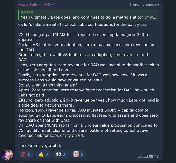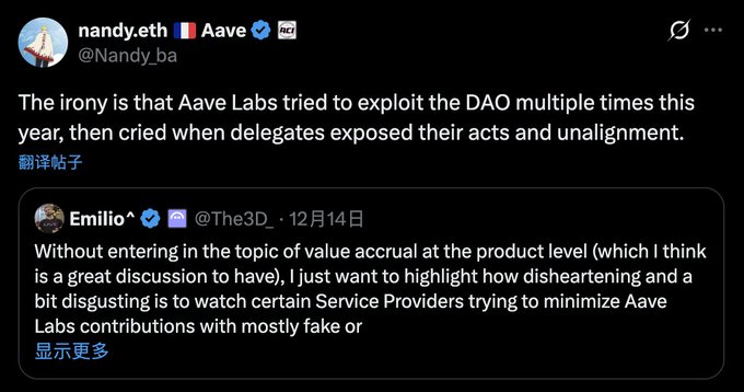 吵架,Emilio认为有人在恶意贬低Aave Labs的贡献和价值。ACI团队成员则指出Aave Labs曾多次试图利用DAO,并且被揭穿。