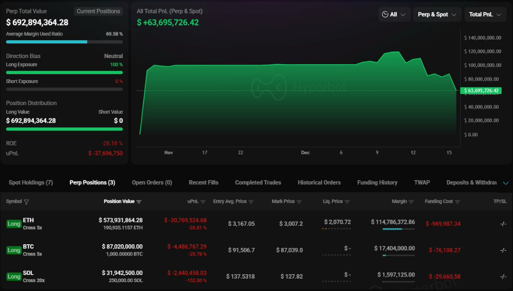 截至12月15日,他的未实现亏损已达到2200万至2300万美元。具体来看,其5倍杠杆的ETH多头仓位平均成本为3169美元,目前浮亏约1680万美元。