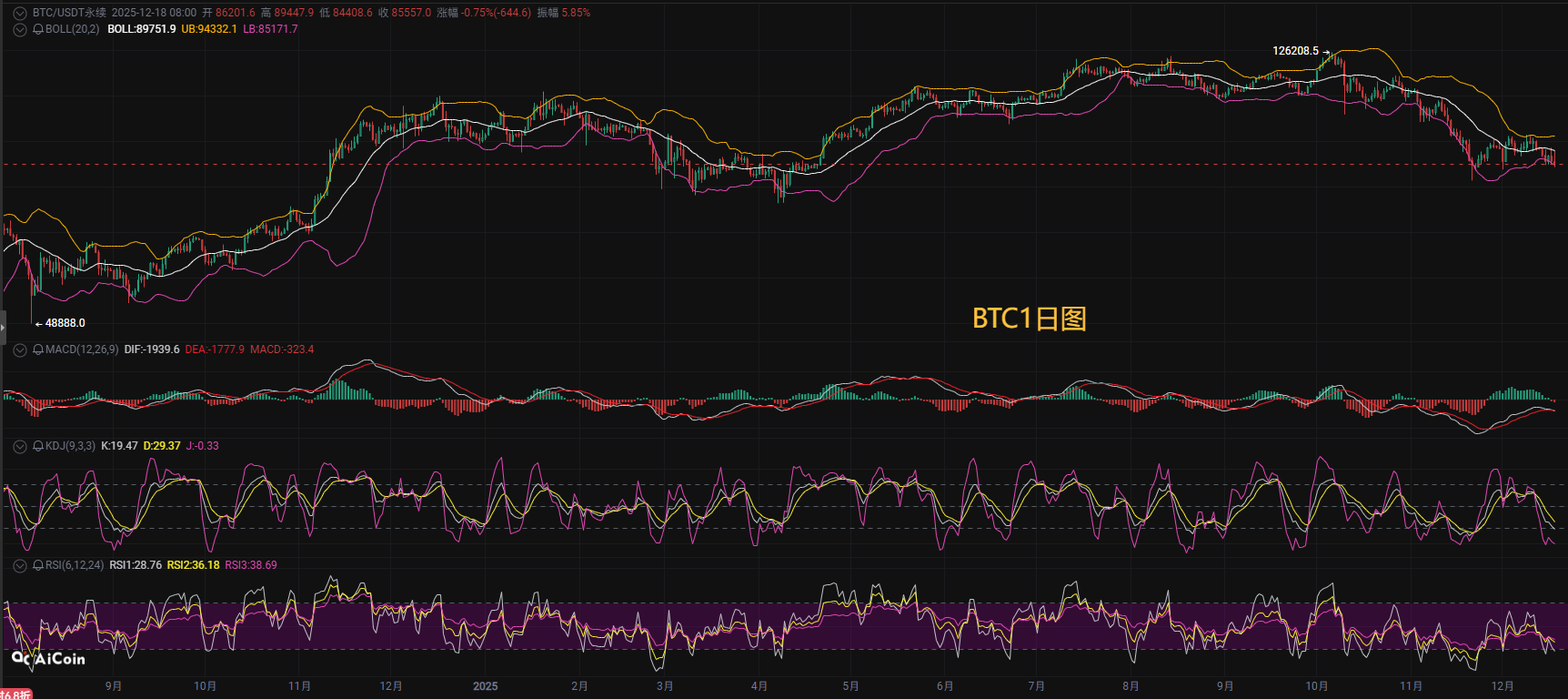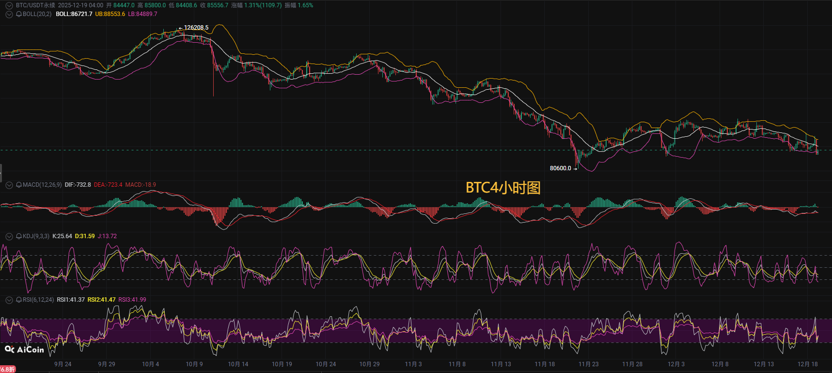 4小时级别图来看,价格在84450附近走出长下影线探底后快速反弹至85600,表明该区域存在显著的短期买盘支撑。日线虽连续三日收阴,但12月16日K线在触及85266低点后形成单针探底,并随后构筑看涨吞噬形态,释放局部企稳信号。