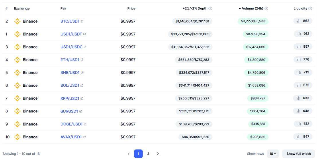 After the WLFI TGE, USD1 has entered a new phase of rapid growth, increasing from $2.462 billion to $3.438 billion in three months, a growth rate of 40%, making it the fastest-growing mainstream stablecoin in the past three months. It ranks seventh among stablecoins and is about to surpass PYUSD (PayPal USD), with a daily trading volume of approximately $1-3 billion, primarily distributed on BNB Chain (55.61%) and Ethereum (37.38%).