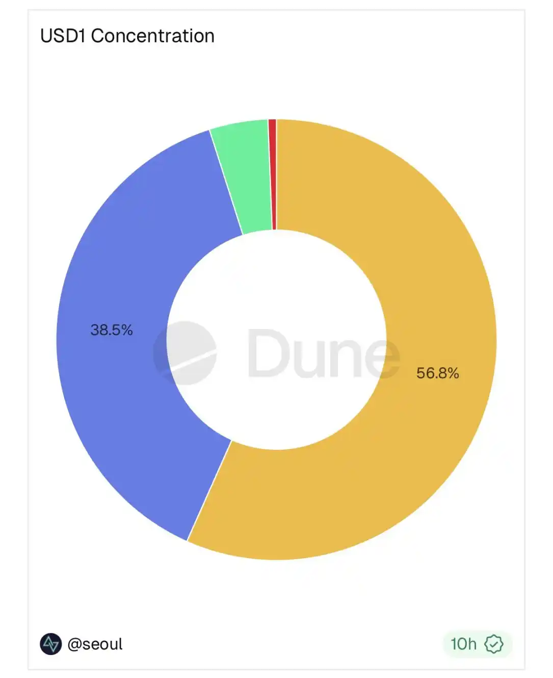 截至 2026 年 1 月 8 日,USD1 的市值约为 33.7 亿美元。从链上分布来看,其发行主要集中在 BSC 和以太坊主网,分别约为 19.1 亿美元和 13 亿美元,两者合计占据绝大多数份额。相比之下,Solana 网络上的 USD1 规模约为 1.43 亿美元,占比明显较低。尽管 WLFI 在生态叙事和合作方向上持续强调对 Solana Meme 生态的支持,但从实际存量来看,USD1 当前仍主要依赖传统 EVM 网络的流动性结构。