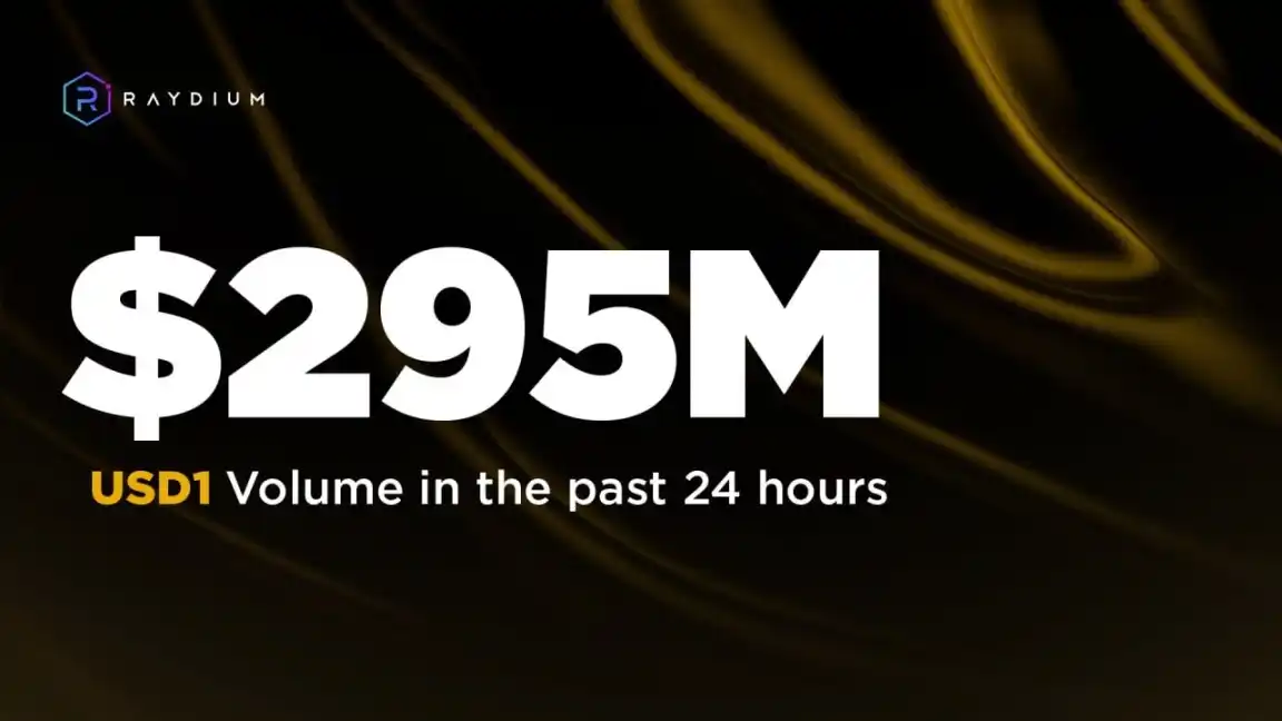 1 月 6 日,Raydium 发布数据显示,过去 24 小时内 USD1 在 Solana 网络上的交易量约为 2.95 亿美元。