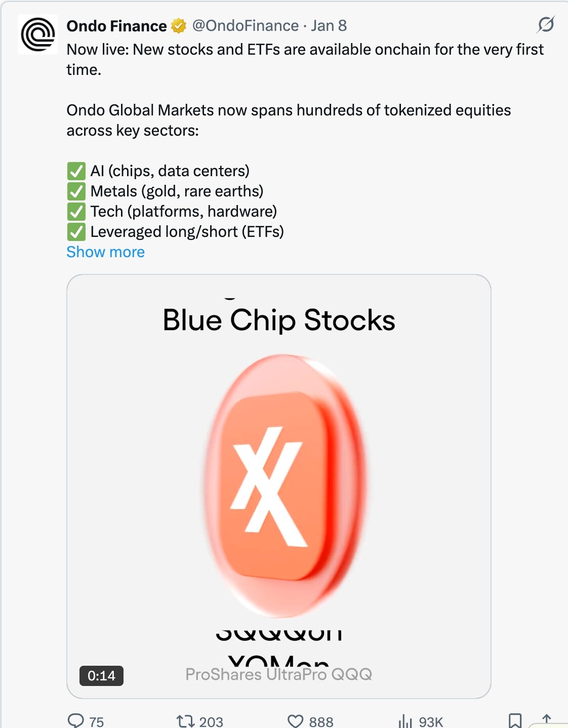 On January 8, 2026, Ondo launched 98 new tokenized assets at once, covering stocks and ETFs in areas such as artificial intelligence (AI), electric vehicles (EV), and thematic investments. This is not a small-scale trial but a rapid advancement.