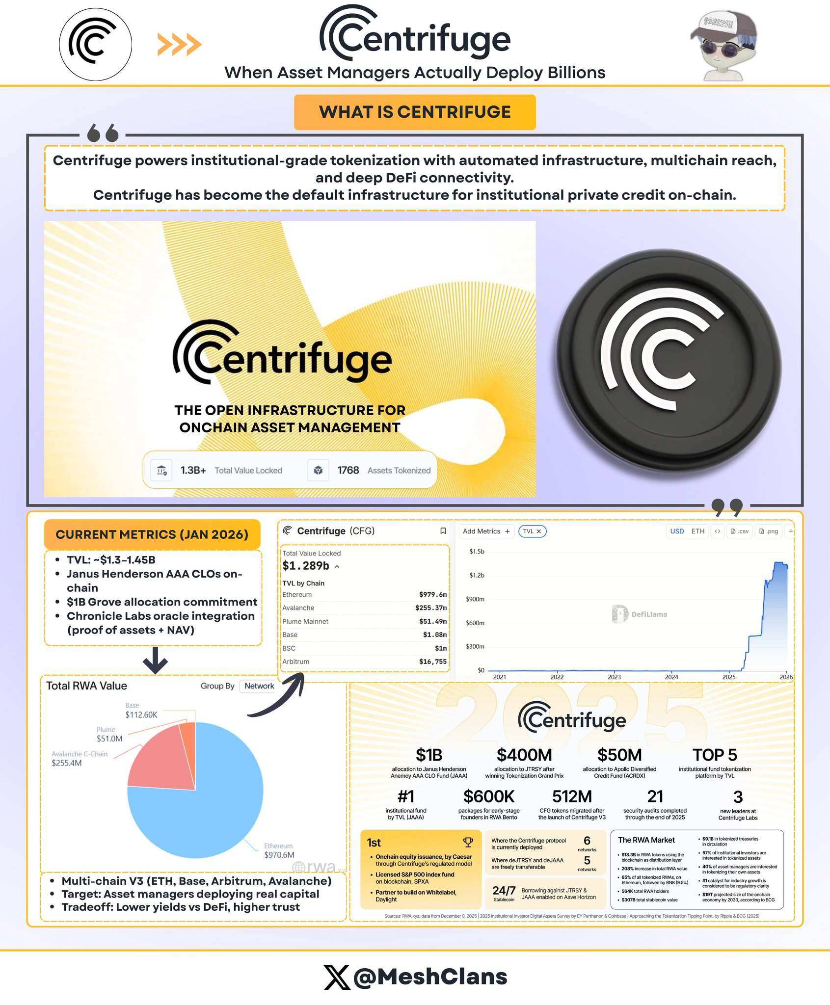 @centrifuge has become the standard infrastructure for institutional-grade private credit tokenization. As of December 2025, the protocol's total value locked (TVL) has soared to $1.3 billion to $1.45 billion, driven by actual deployed institutional capital.