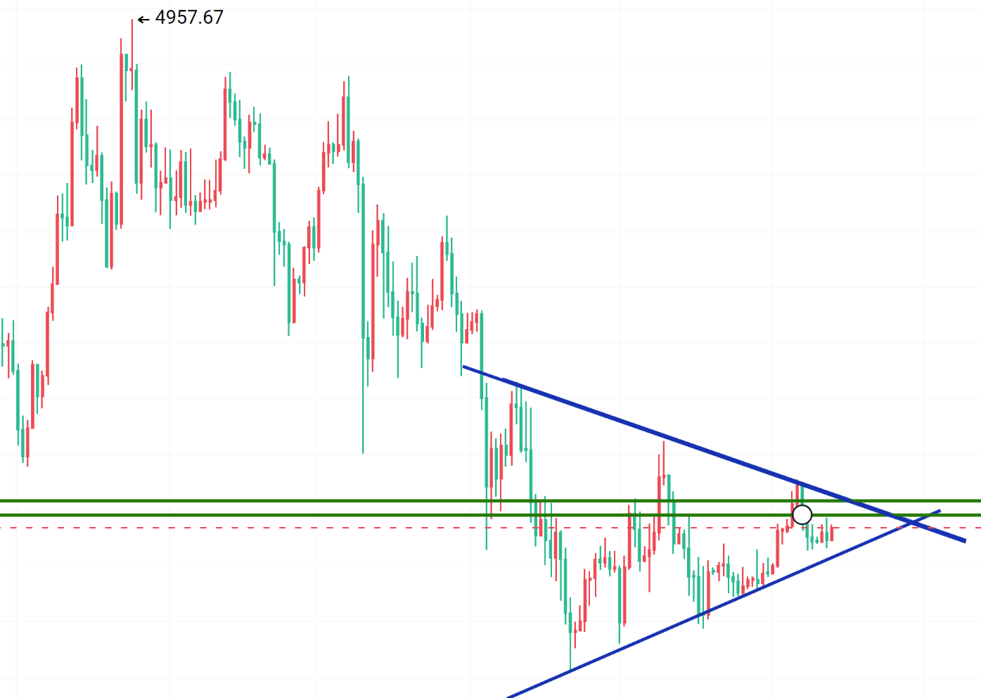 行情来回扎针,反复震荡,所以操作上一定不要心急,多看,少动!这种时候市场上多空分歧大,又都在开始画饼了,看多的开始画10万15万的大饼,看空的画8万跟6万的大饼,大家多看少动,沉住气,管住手。三角收敛,破位在即,不破不追,不去过度猜测,预判行情!