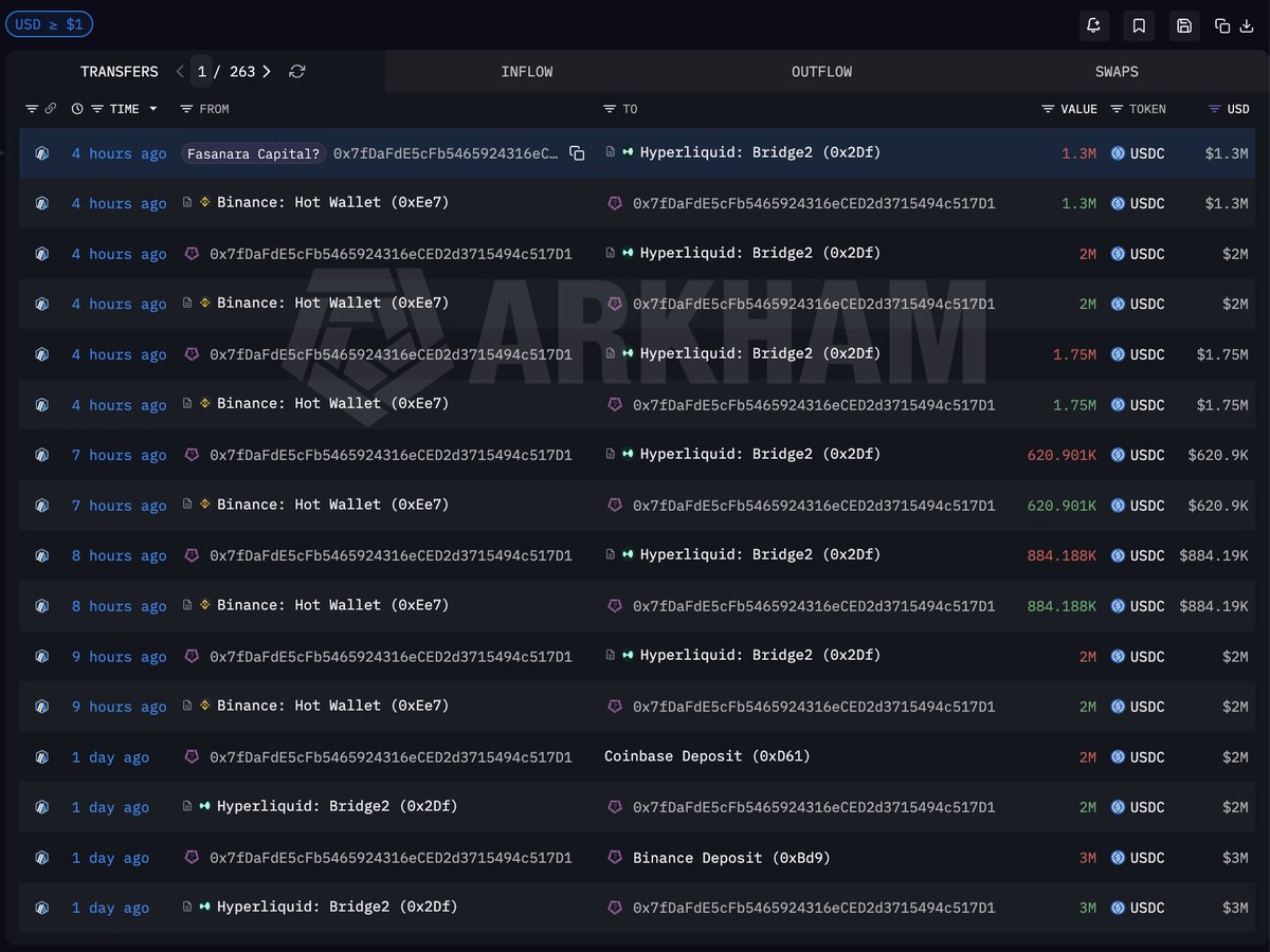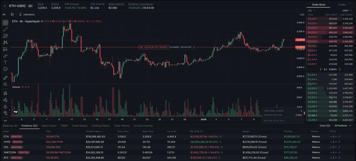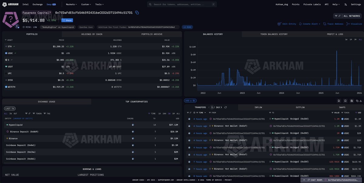 与Fasanara Capital相关的Hyperliquid交易账户“BobbyBigSize”目前在加密货币上做空1.928亿美元。他最大的头寸是1.16亿美元的以太坊空头,目前亏损300万美元。