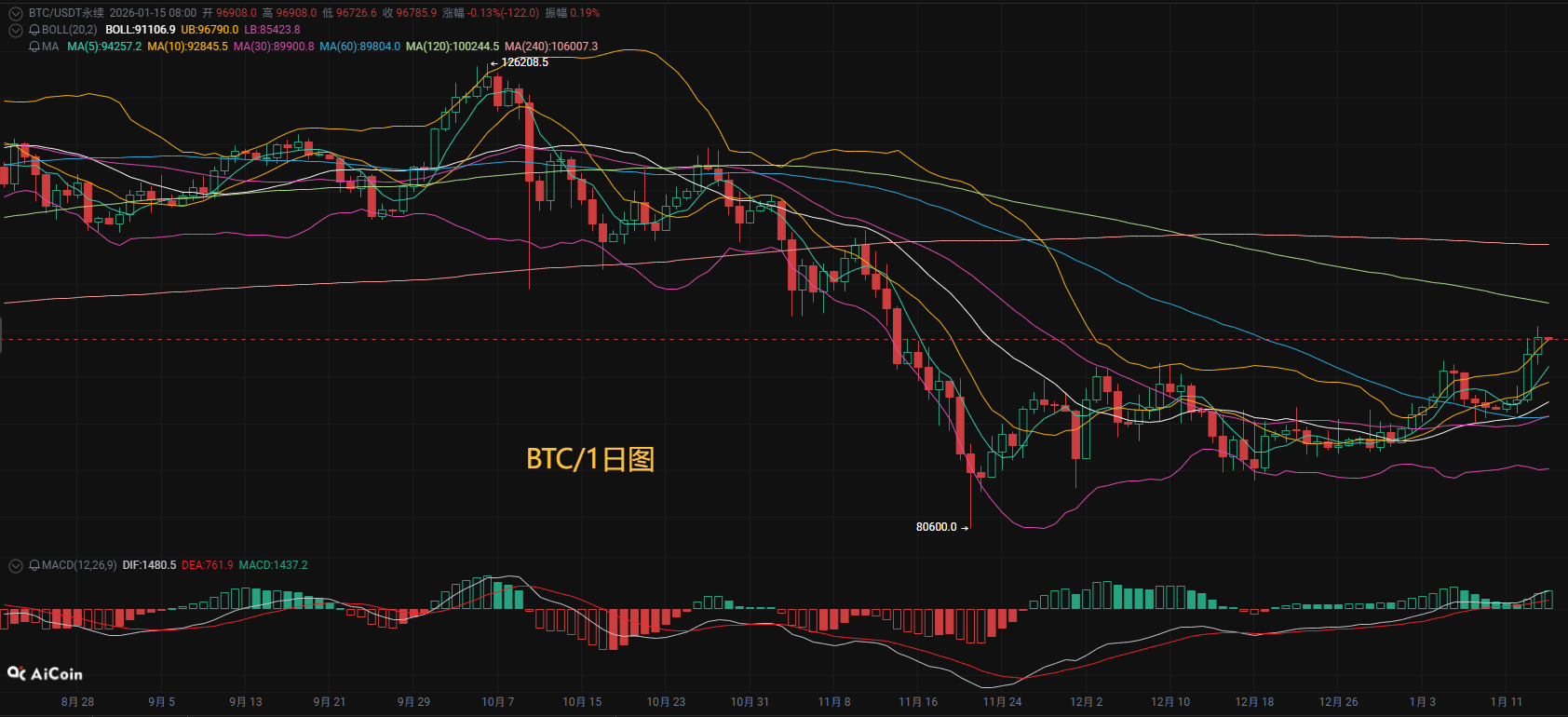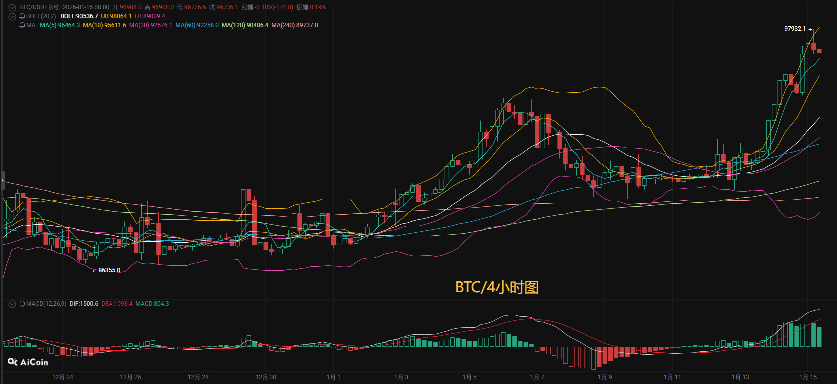 比特币价格继续走出强势反弹,行情重回95000上方区域,可惜后续价格并未顺势突破98000一线压制,延续这波反弹之势。短线在多次试探之后,多头情绪开始减弱,目前价格在96800位置附近,行情处于回调测试支撑当中,短期上行趋势未变,且币价保持高位震荡,在日线级别呈现阶梯式上涨的背景下,1月14日收出带上下影线的中阳线,确认突破95000压力区,同时价格始终站稳EMA30(93006)上方,其中EMA7(95891)与EMA30保持金叉,且120日均线(91126)构成长期支撑。