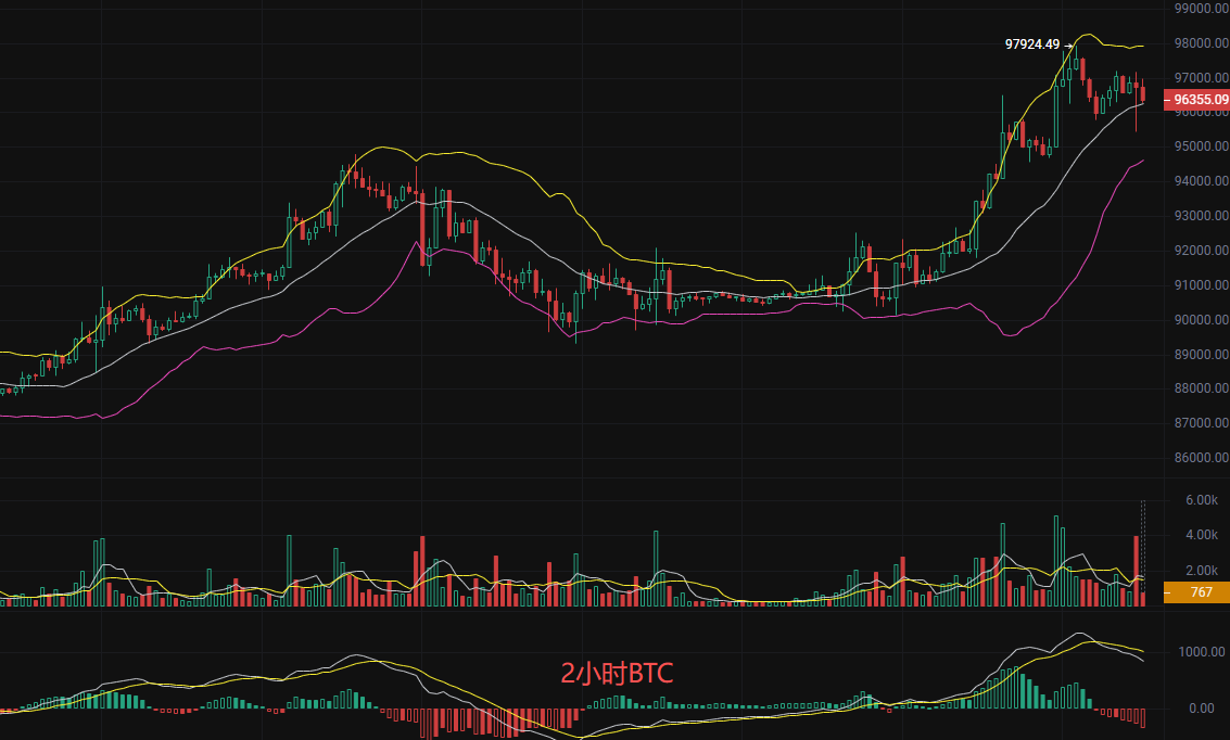 The current price of Bitcoin is 96,500. Li Ying assesses that the current market is in a high-level consolidation phase, similar to yesterday. The daily line quickly rose from a low of 91,300 to a high of 97,925 before retreating. In the 2-hour chart, there have been consecutive long upper shadows and bearish candles, indicating heavy selling pressure above, with fierce competition for short positions in the short term. The MACD on the daily chart shows weakening momentum, while the 2-hour chart is slightly bearish. The RSI on the daily chart has dropped from the overbought zone of 77 to 57, indicating a decline in upward momentum. The EMA price is operating below the EMA7 and is gradually approaching the EMA30. A break below the EMA30 may further test the EMA120, which would extend the bearish trend; conversely, it would indicate consolidation.