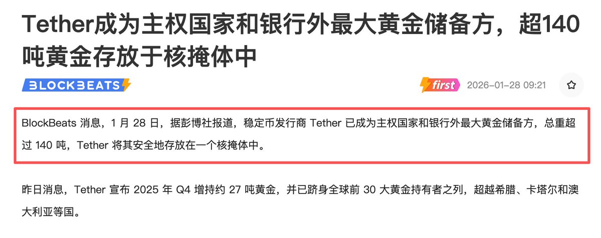 可核实报道里黄金持有量“全球第一”的公司是 Tether。