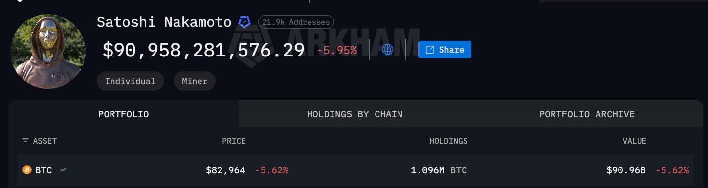 Arkham的“Satoshi Nakamoto”实体,汇集了21,900个归属于创始人早期挖矿时代的地址,显示其投资组合价值在比特币跌至82,964美元后接近910亿美元,持有总量为1,096,000 BTC。
