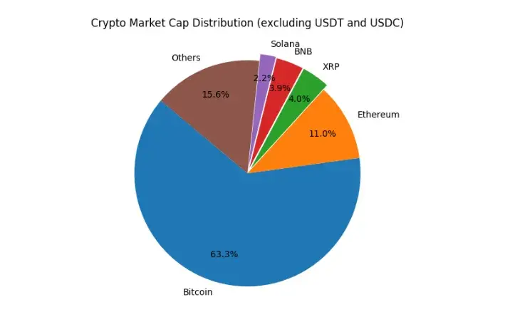 为了更直观地说明这一点,与传统金融相比,加密市场的集中度要高得多。在美国股票市场,科技七巨头占有31%的市值,而前500家公司(即标普500指数)占有84.7%。传统金融拥有比加密货币多一百倍的公司数量,却仅达到与加密货币前五大资产相同的市值占比。