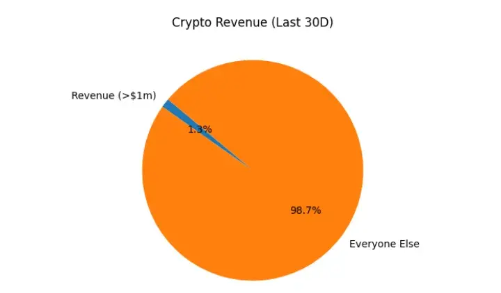 为了增加需求,这些项目需要在商业上取得成功。然而,许多加密业务都以失败告终。对于一个万亿美元级别的行业,在DeFiLlama上列出的5600多个协议中,只有76个在过去30天内产生了超过100万美元的营收,仅占1.3%。