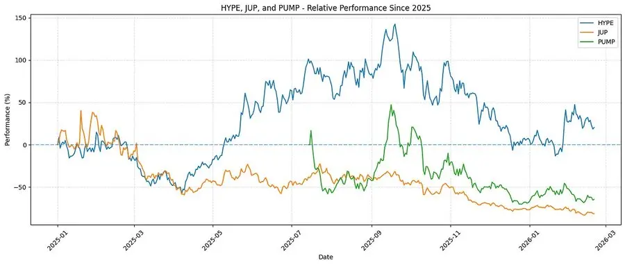 此外,当你观察营收集中度时会发现,2025年排名前10的协议占据了80%的营收,前3名占据了64%。仅Tether一家就占据了加密行业总营收的44%。令人惊讶的是,在这10个协议中,迄今为止只有3个发行了代币(Hyperliquid, Pumpfun, Jupiter),而且回顾它们的相对表现,只有HYPE表现较好。