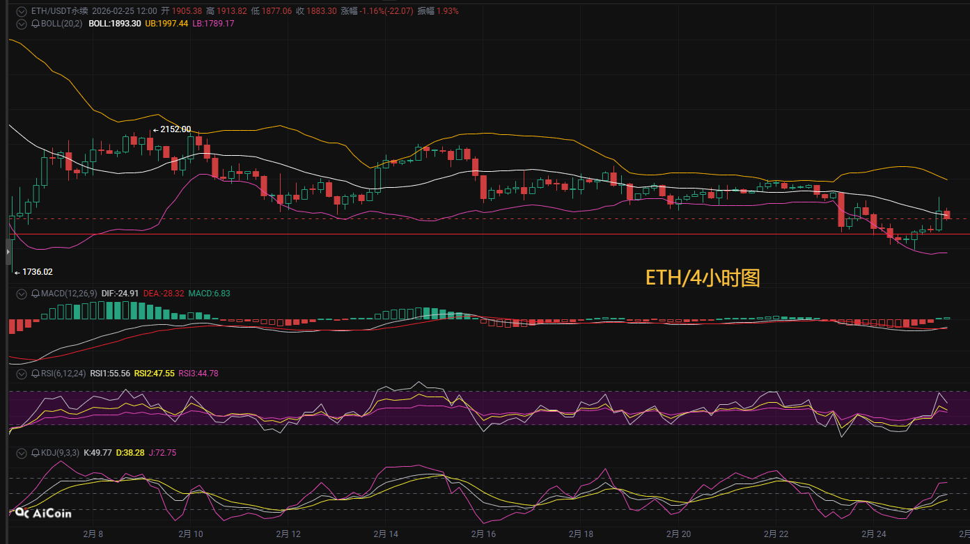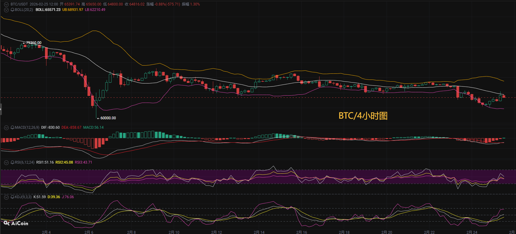 4小时图来看收出长上影线触及66283.1,短线66000上方抛压依然强劲。日线级别在连续三日收阴后出现带量反弹,形成孕线结构;同时1小时图在63500附近构筑双底形态。从技术指标来看,4小时MACD金叉刚刚形成,但日线MACD仍处于零轴下方。均线方面来看,当前价格已站稳7日均线(64667.8),但30日均线(65813.5)与120日均线(69528.2)大区间仍呈现弱势趋势。操作上建议反弹空主,上方压制关注66300-67000,下方破位关注63500附近,