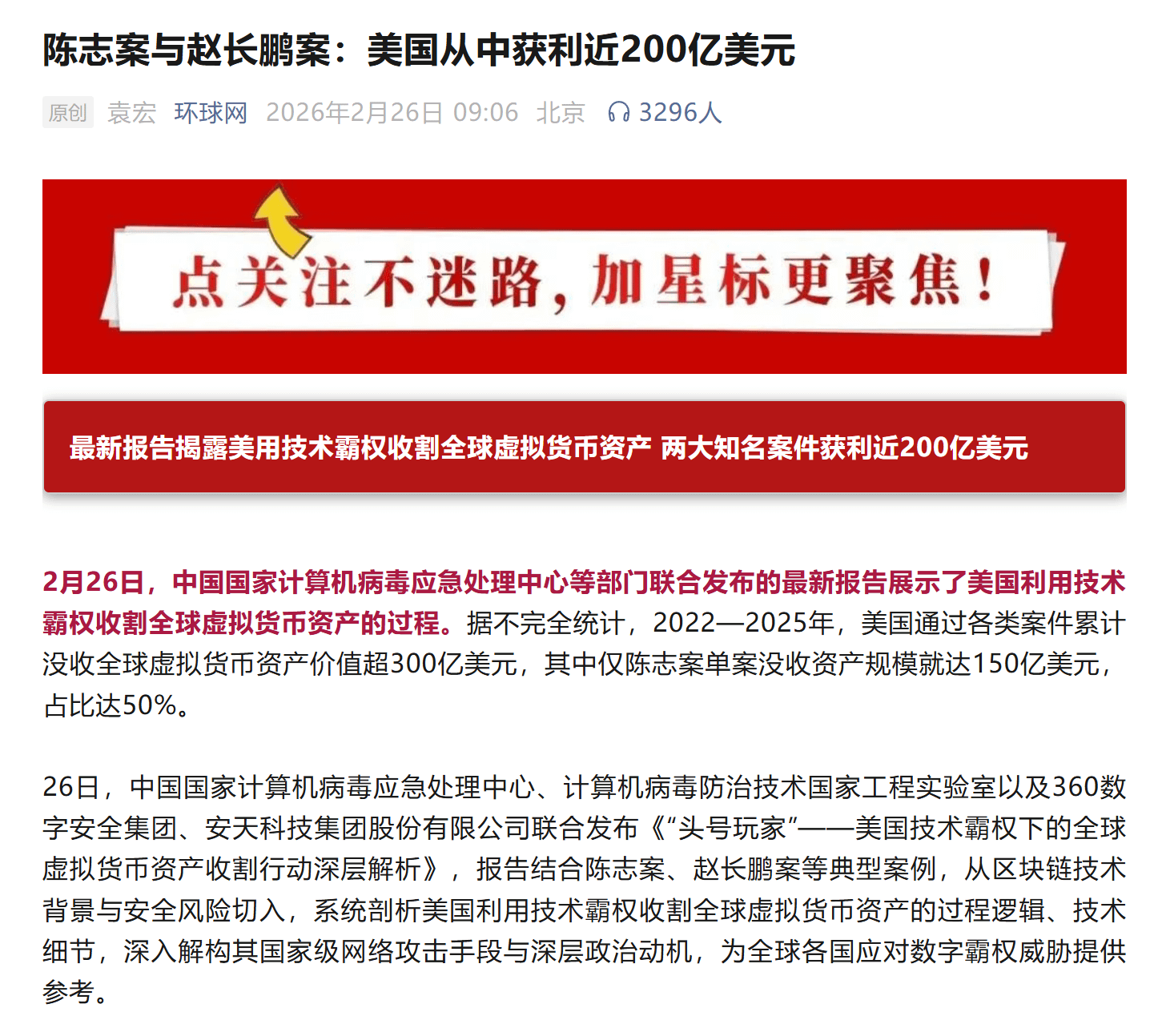 截至2026年1月底,全球虚拟货币总市值约2.73万亿美元,其中比特币市值达1.57万亿美元,规模相当于全球官方黄金储备总市值的47% 。面对这一数字财富金矿,美国凭借先发技术优势、产业聚集优势、完善法规体系与强大执法能力,构建“技术优势—法规绑定—机构执行”三位一体收割体系,通过网络攻击、规则围堵、定向收割、远洋捕捞等手段,实施精准化、规模化数字掠夺,严重侵害全球各国技术主权、经济利益与政治安全。