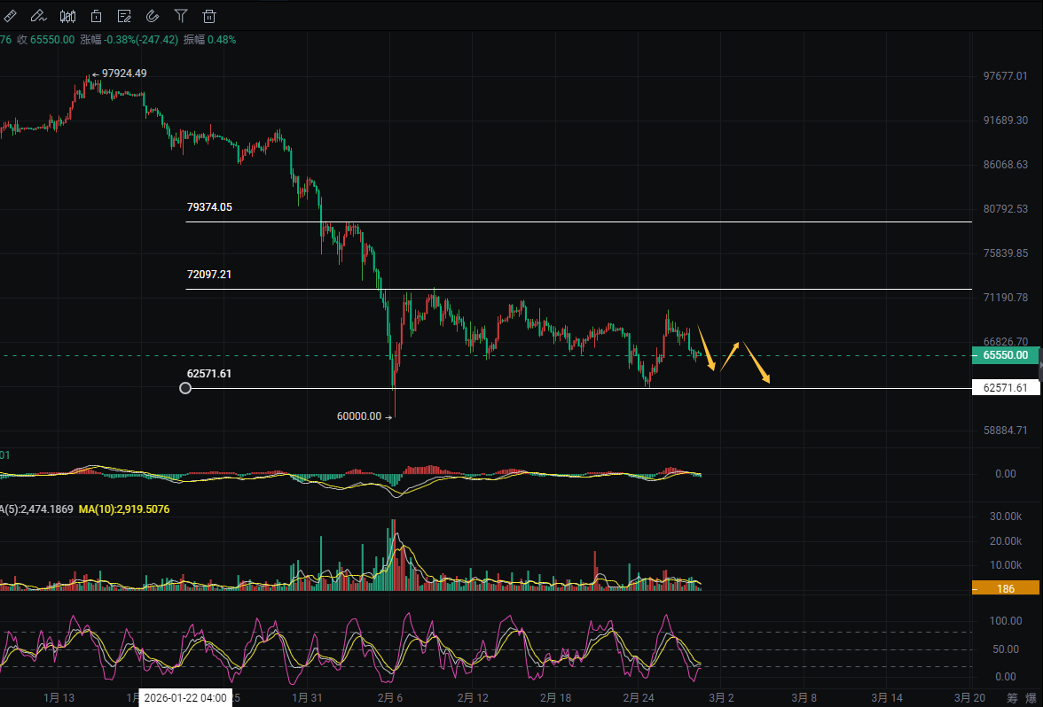 看空的思路没毛病,只是进场点位不一定很好,所以胆大的人先享受世界,看到就直接冲进去了反而还拿到了。废话不多说,直接看今日的盘面分析,大饼日线级别已经连续二连阴,说明反弹的延续被夭折了,目前重回到了64000–68000大区间震荡内,MACD零轴下方,绿柱持续,空头动能未减。RSI约38,接近超卖但未反转,弱势偏空。价格在所有短期均线下方,中长期均线空头排列,大趋势未改;4 小时级别从68300附近回落,在64800附近获支撑后小幅反弹,整体处于下降通道内;1小时目前也是中性偏弱,周末需谨防价格再度下探。操作上重点关注上方阻力位68300,下方支撑62500,日内继续以高空为主,低多为辅。