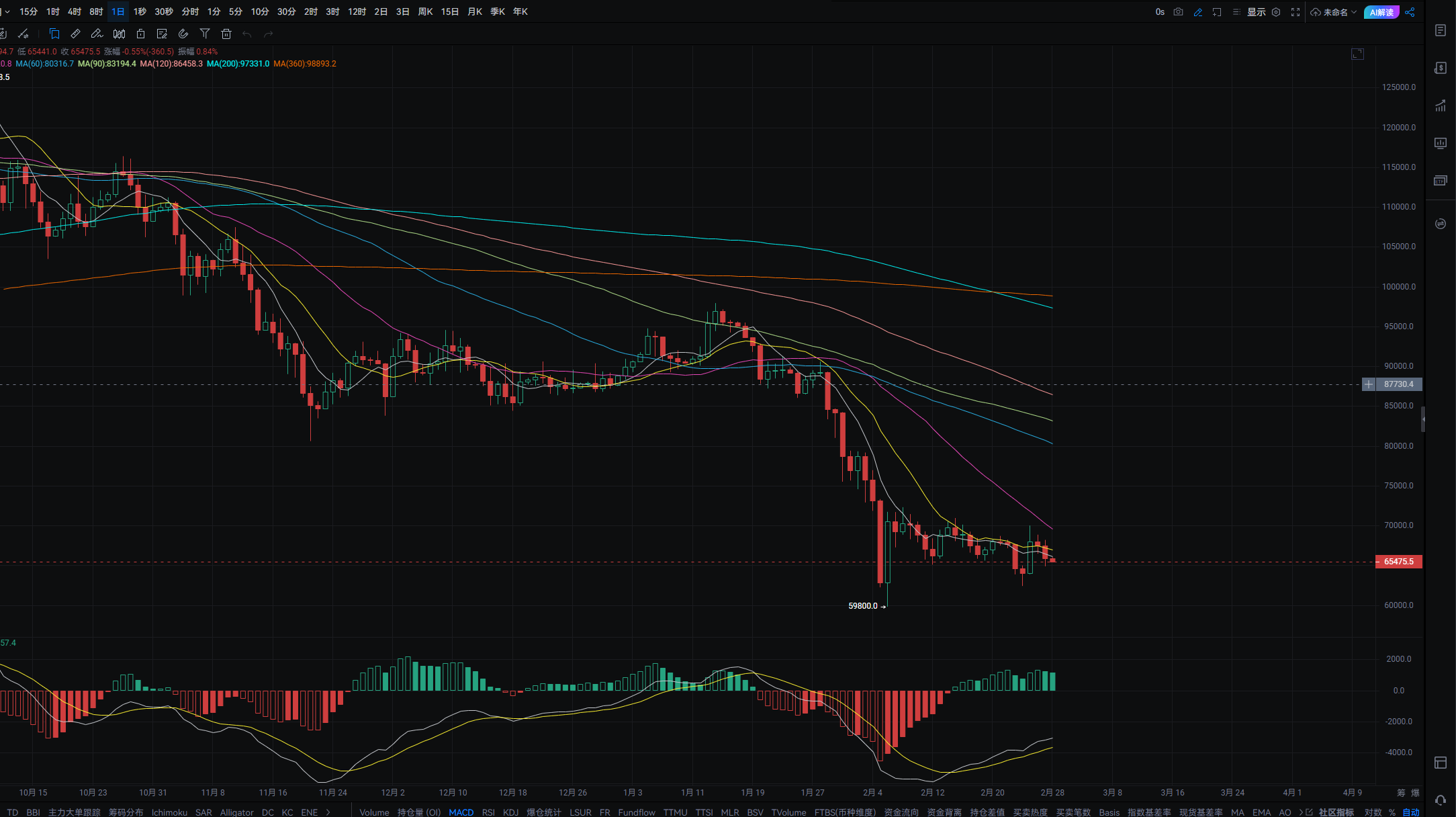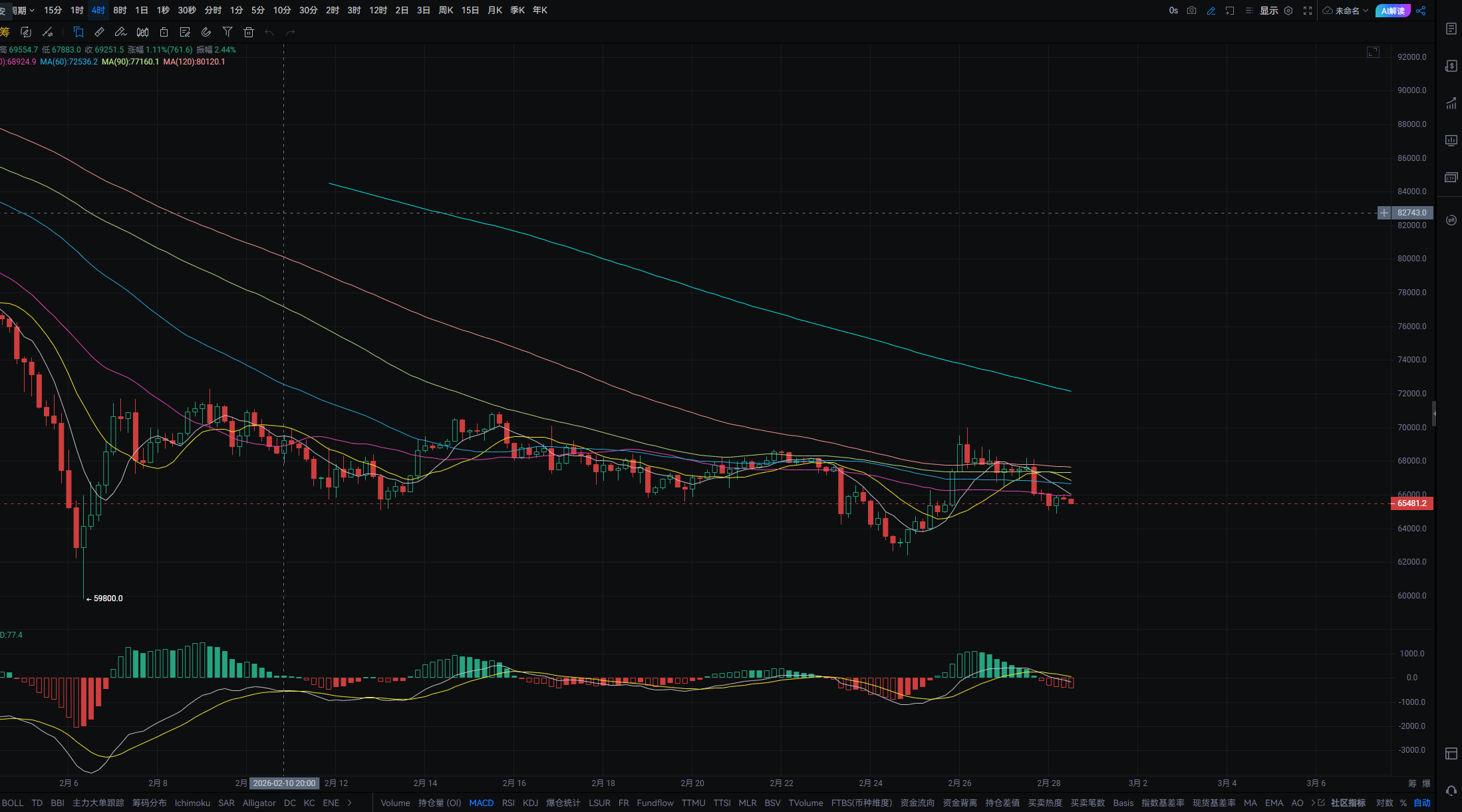 美股和BTC双双下跌,但作业却不难写,就像这两天一直在说的,市场的情绪可以通过财报带动,但流动性并不会因为财报而改善,尤其是连续四天都在说的机构资金和整体市场抛售的趋势都是当前行情的佐证,目前的核心叙事仍然是流动性不足,资金量不足带来的相应,解决这个困难需要的还是货币政策。数据来看,仍然是成交量和换手率双双下降的一天,这就没啥可说的了,投资者的买入情绪已经从财报中脱离出来了,从哪里涨回来的又跌回哪里了,这就是流动性不足,每一次的上涨可能都是机构和对冲基金的退出流动性。下方回踩65130-64750附近可进行接多,反弹目标可看至66130-66500附近