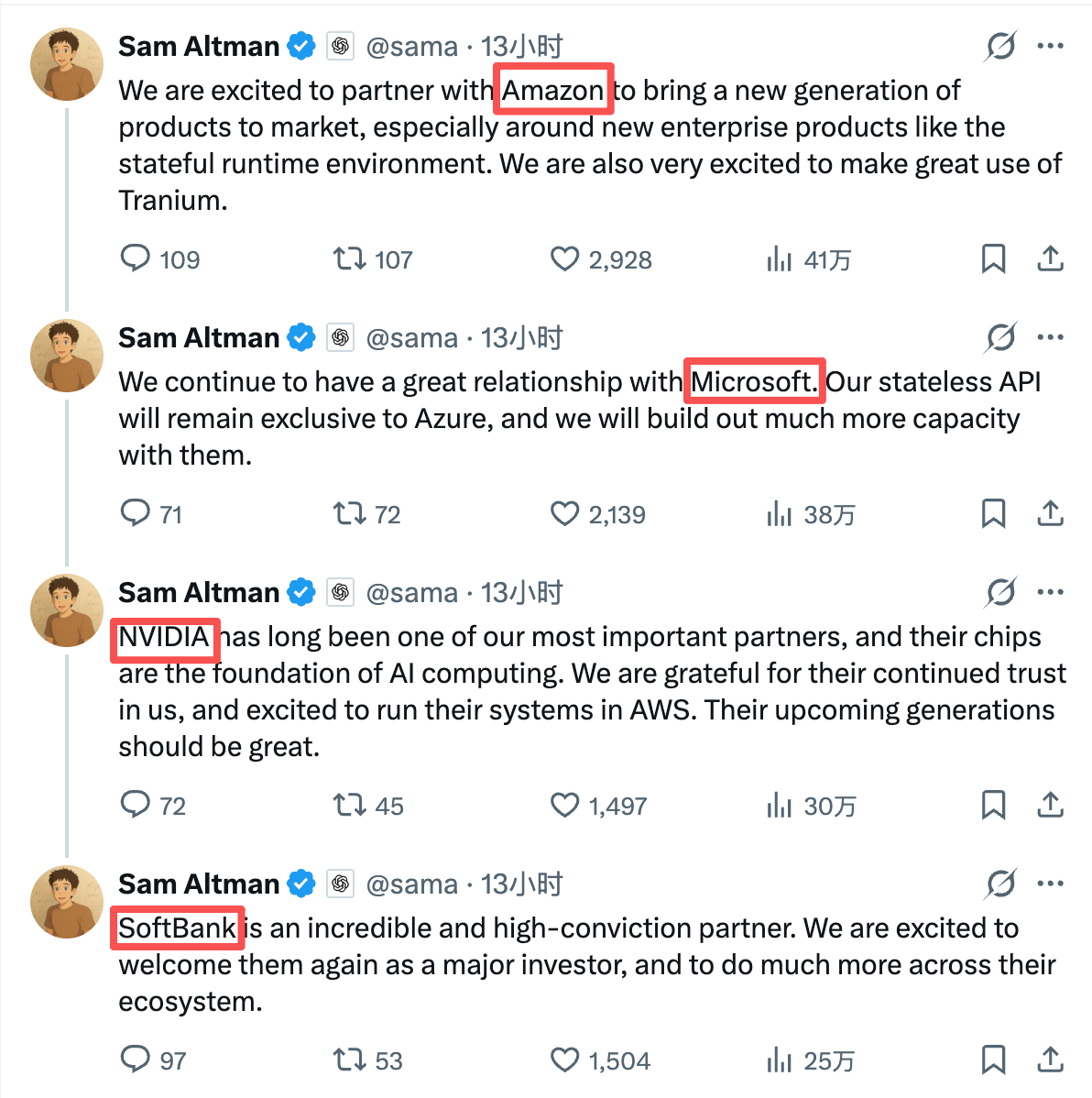 在融资完成之后,OpenAI 创始人 Sam Altman 于个人 X 账户接连向三大出资方表示感谢。但值得一提的是,Sam Altman 的致谢顺序分别是亚马逊、微软、英伟达、软银 —— 本次未出资的“老”股东兼重要合作伙伴微软的名字,紧跟着承诺出资最多的亚马逊被提及。