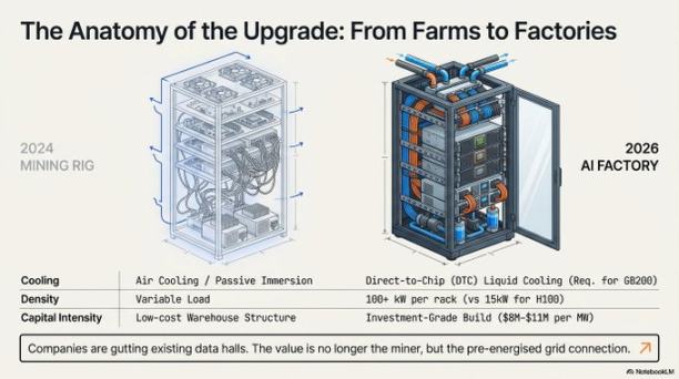 2026 年 AI 的技术要求,让过去那种风冷矿机设计不仅过时,而且根本没法用来部署高密度的 AI 集群。