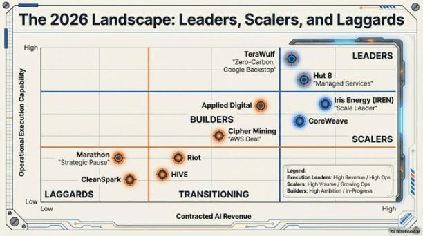 • TeraWulf 和 Hut 8:公认的执行领导者。这两家公司分别拿下了价值 67 亿美元和 70 亿美元的合同,成功地将矿场改造成了高价值、符合投资级标准的 AI 资产。