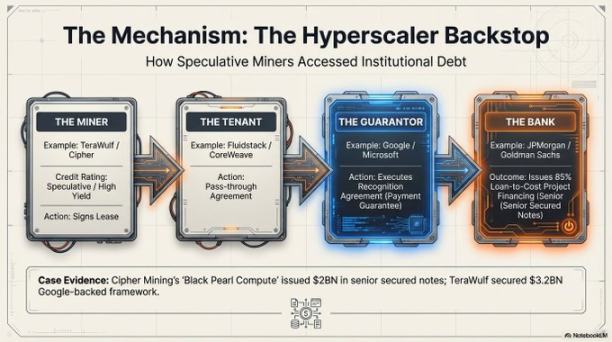 这样一来,原本风险很高的矿工租赁合同,就变成了风险很低的科技巨头信用合同。结果就是,这个行业能以大约 7.125% 的优惠利率进入债券市场。像 Cipher Mining 和 Hut 8 这样的公司,就能从摩根大通、高盛那里拿到高达项目成本 85% 的、不会稀释股权的项目融资。这种「照付不议」条款的「房东」模式,吸引了 Vanguard、Oaktree 和 Citadel 等机构的大量资本涌入。