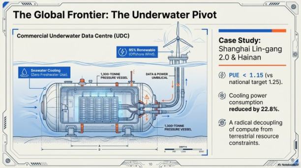 • 技术指标:这个设施的电源使用效率做到了 1.15,远超国家 1.25 的目标。它利用海水作为主要散热源,总功耗降低了 40-60%。
