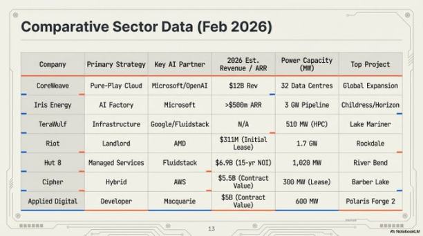 • Iris Energy (IREN):行业规模领导者,估值 140 亿美元。它坐拥 2910 兆瓦的电力与土地组合,支撑着其不断扩大的「AI 工厂」版图。