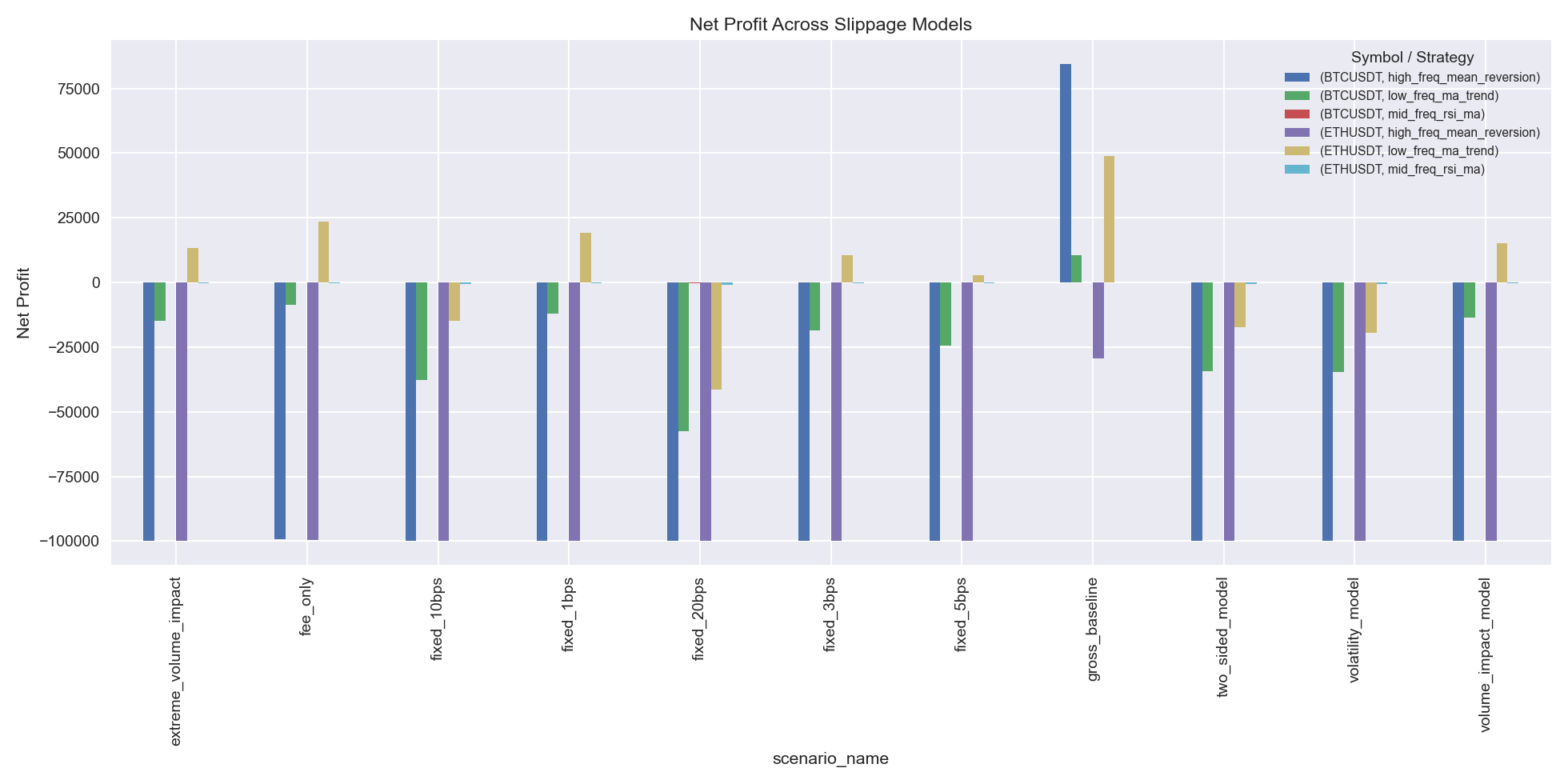 图解:这张图提供了一个相对积极的参照。ETH 低频趋势策略在无滑点时表现更强,加入手续费和滑点之后利润明显被压缩,但仍保留正收益。这说明滑点并不是让所有策略都失效,而是在筛选哪些策略的优势足够厚,哪些策略只是建立在理想成交假设上。