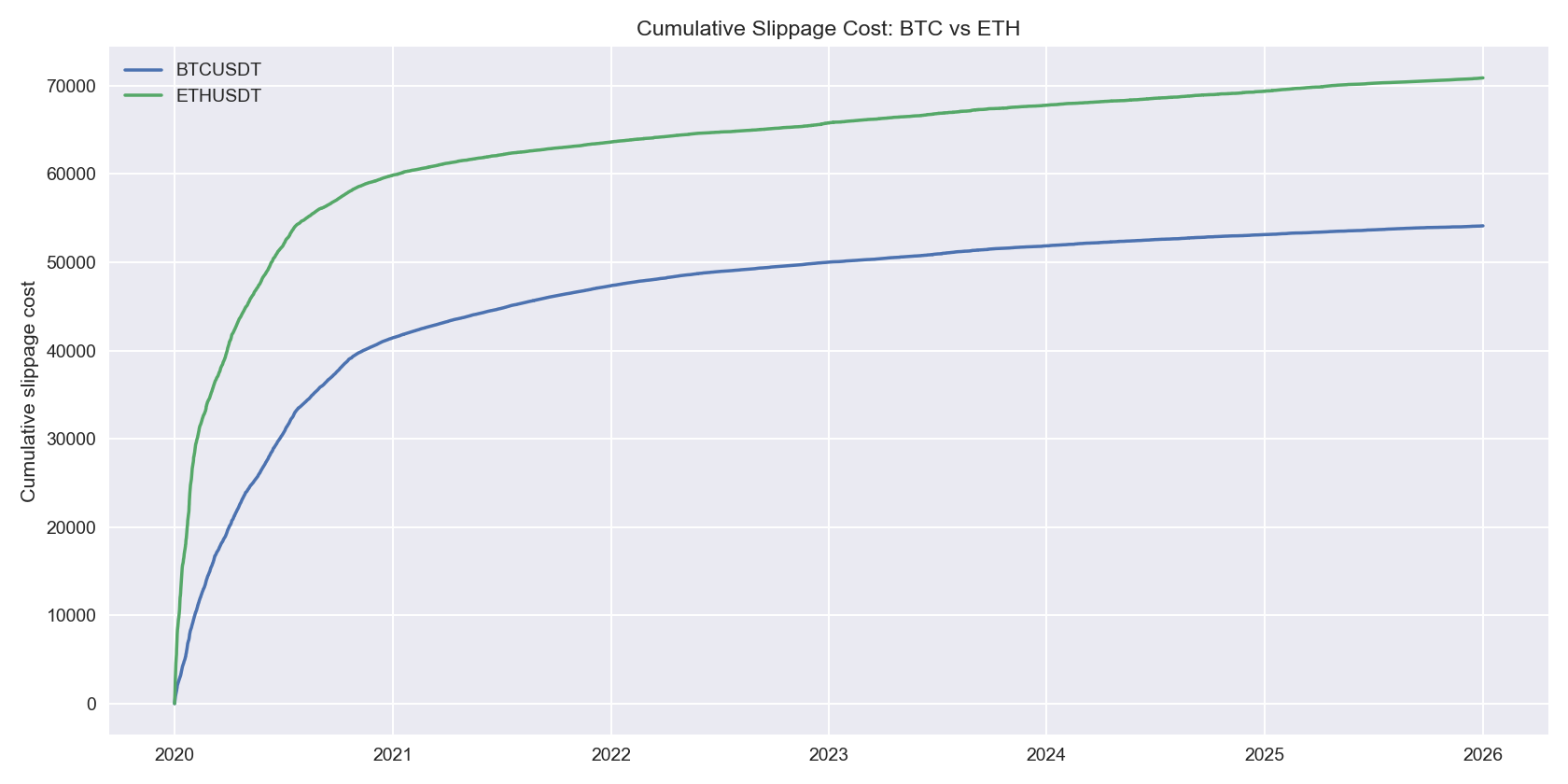 图解:这张图看的是绝对美元口径下的累计滑点成本。ETH 在这次样本中的总滑点损耗高于 BTC,说明即便不是所有时段都比 BTC 更“难做”,但从长期执行成本角度看,ETH 对流动性摩擦更敏感。