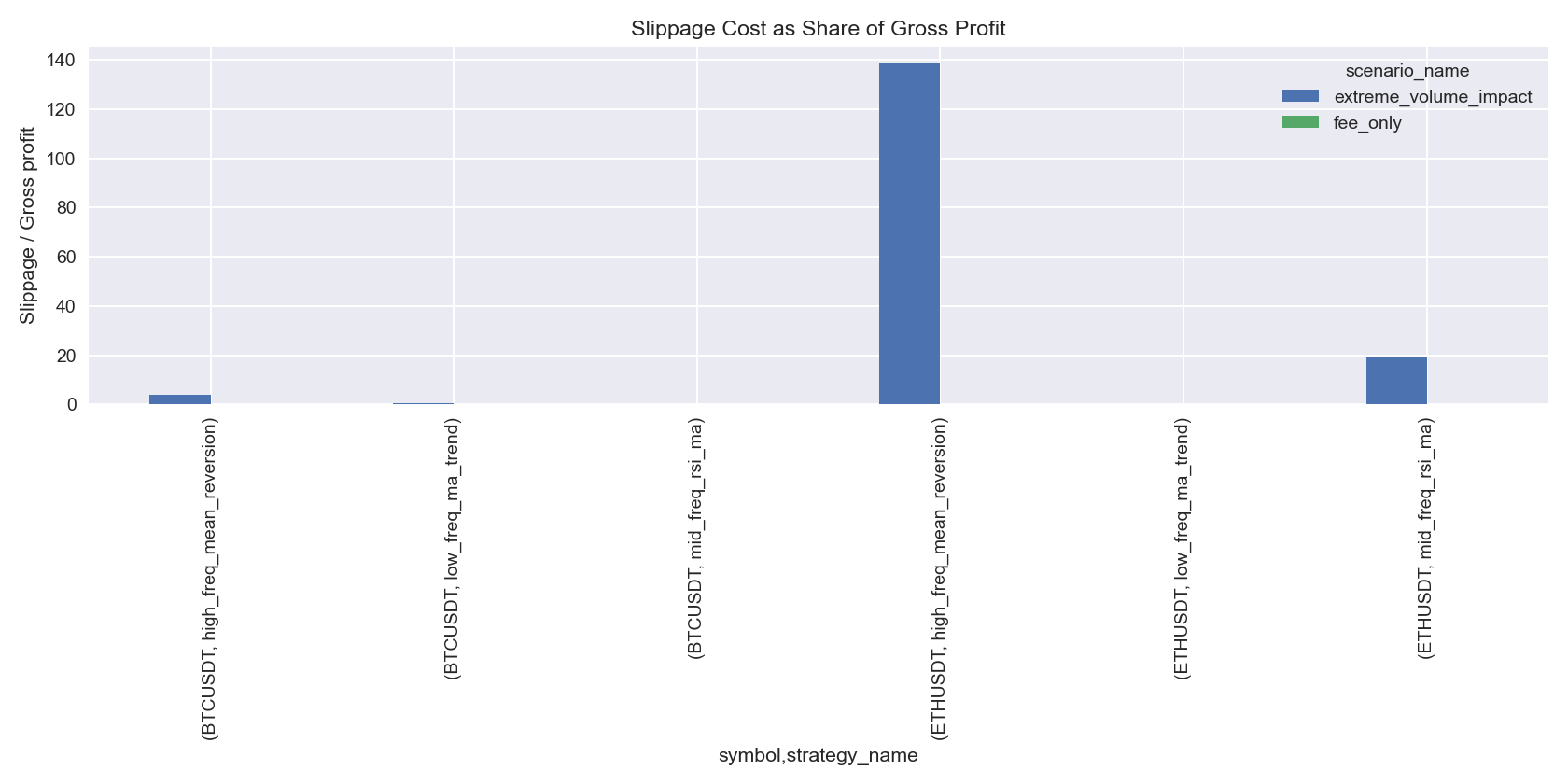 这张图展示了不同频率策略的“净利润侵蚀量”。高频策略几乎是断崖式地高于中低频,说明在加密市场里,滑点的打击面高度集中于高换手策略。很多高频系统不是赚不到钱,而是赚得不够多,抵不过频繁交易带来的持续摩擦。