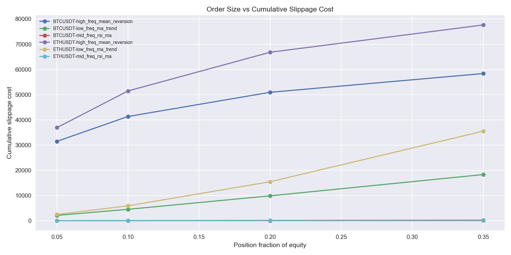 图解:这张图展示了不同下单规模下的累计滑点损耗。曲线并不是一条平滑直线,而更接近凸性抬升。尤其是 ETH 高频策略,随着仓位从 5% 提升到 35%,滑点恶化得非常快。