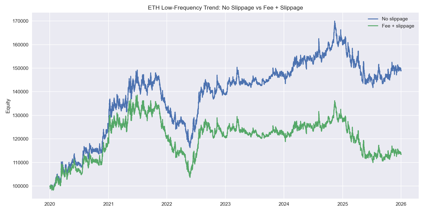 这也是为什么 `ETH` 低频趋势策略虽然仍能盈利,但利润相较无滑点版本已经明显被压缩。它说明 ETH 不是不能做,而是更需要给执行成本留足安全垫。