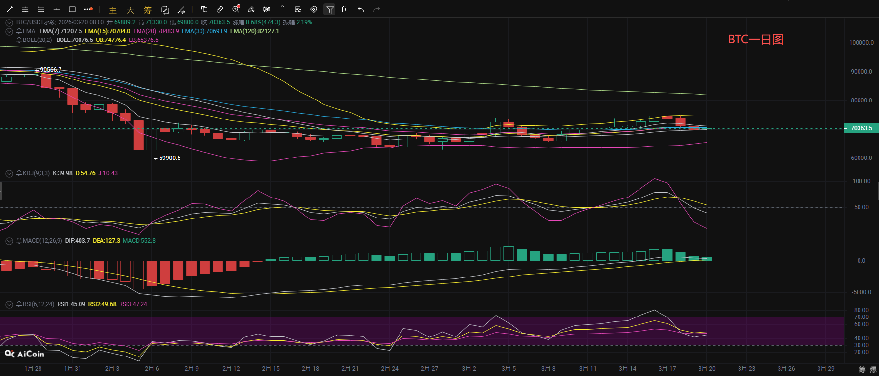 昨日晚间分析文章发布后,比特币如期回撤测试下方支撑,企稳后走出小幅反弹;今日币价高位触及71300 一线再度承压回落,盘面进入区间震荡整理阶段,截至发稿,币价在 70300 附近运行。从日线级别来看,比特币当前价格位于布林中轨上方,但已跌破 EMA 短期均线,整体呈现高位震荡偏弱格局。MACD 指标中,DIF 与 DEA 双线仍在零轴上方运行,尚未形成死叉,不过 MACD 量柱持续收窄,显示多头动能显著衰减,有向空头转换的迹象;KDJ 指标中 J 值已进入超卖区间,K、D 线同步向下,短期超跌后存在技术性修复需求;RSI 三线在 45 附近徘徊,未进入极端区间,且已跌破短期均线带,下方MA30(69000)构成弱支撑,后续若无法快速收复均线,将进一步下探测试前期低点。