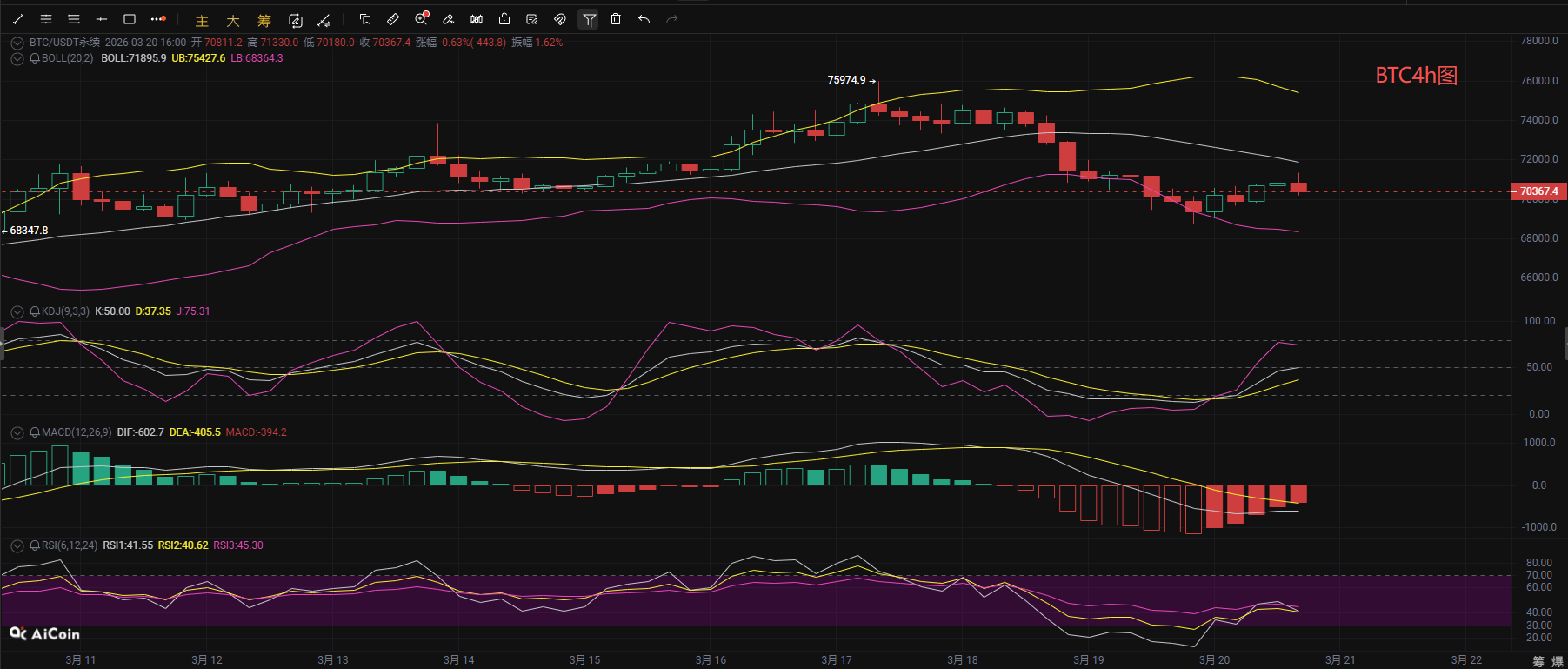 从4 小时级别来看,比特币当前价格运行于布林带中轨下方,下轨 68400 一线提供支撑,整体处于高位回落的震荡下行通道。MACD 指标中 DIF 与 DEA 双线在零轴下方发散,量柱逐步收窄,空头动能有所衰减;KDJ 指标中 J 值向上拐头,K、D 线同步抬升,短期超跌后存在技术性反弹需求;RSI 三线在 40 附近徘徊,尚未进入极端超卖区间。上方需重点关注布林带中轨 71900 压力位,若反弹无法放量突破该区域,4 小时级别将延续震荡下行走势,进一步测试下轨支撑。操作上可等待后续反弹至压力位附近承压无量时,顺势布局高空,目标看向下方支撑区域,操作期间务必严控仓位、严格设置止损,切勿重仓追涨杀跌。