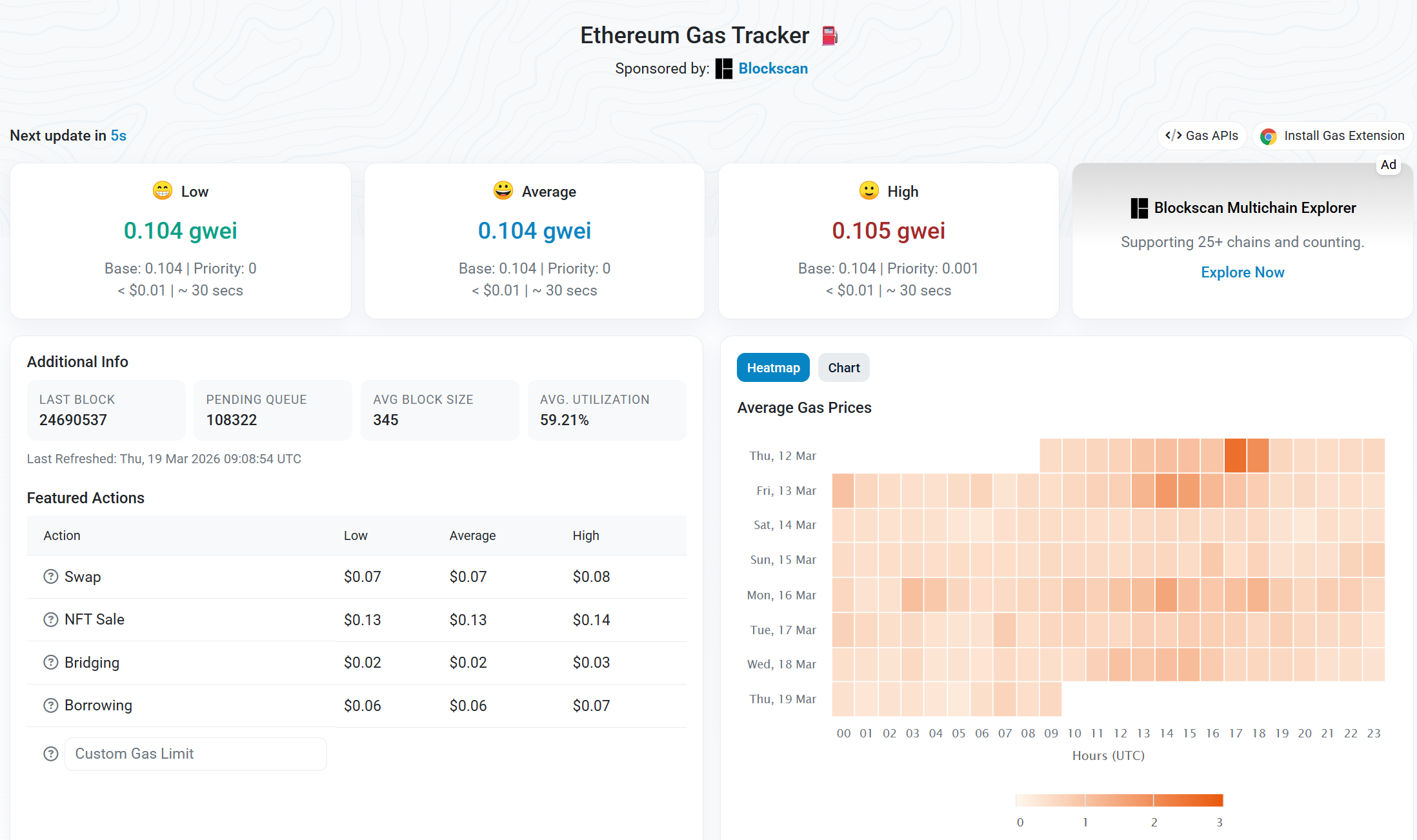 把 Glamsterdam 和 Hegotá 放在一起看,会发现以太坊 2026 年真正的主线,不是某一个单点功能,而是一种明显的战略转向:L1 不再只是“安全底座”,而是在继续保住安全底色的同时,向更强执行力、更低协调成本和更好账户体验延展。目前以太坊的 gas 价格已经处在极低水平:Etherscan 在 3 月 19 日的快照中显示,低档 gas 低至 0.1 gwei,多个时点也在 0.1–0.3 gwei附近波动。这说明,经过 Dencun、Pectra、Fusaka 以及 L2 吸收流量之后,以太坊主网已经不再处于过去那种“常态化高 fee”环境。