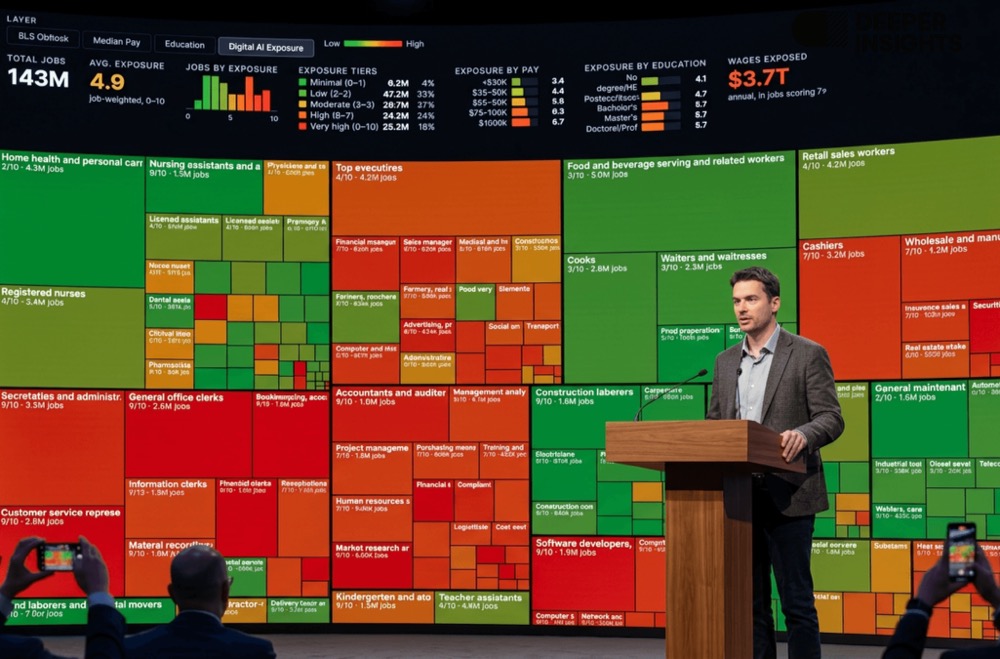 恐慌情绪更在全球蔓延。从《2028 全球智能危机》中「AI 取代人类」的末日叙事,到 AI 大神 Karpathy 发布的「AI 职业风险图」刷屏全网,这股不安正迅速席卷全球。
