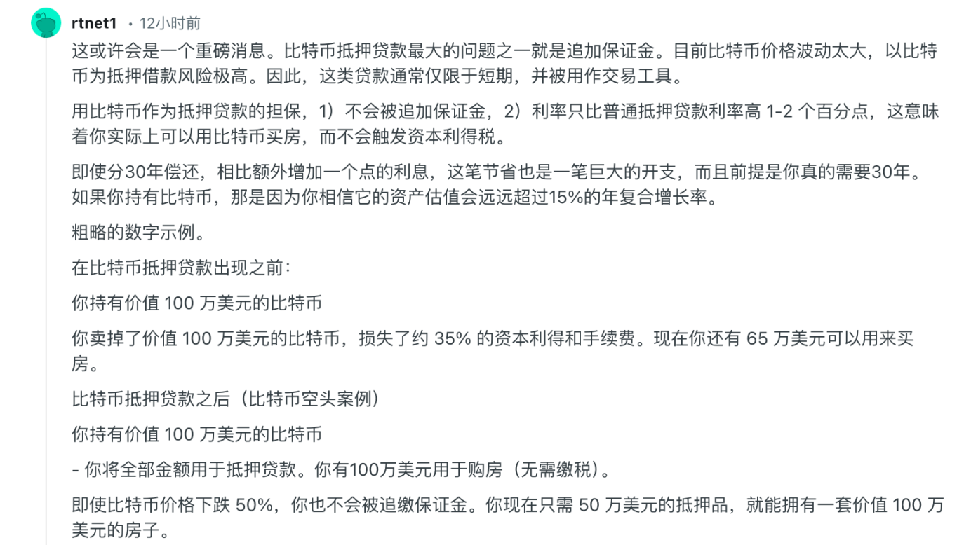 当然,支持的声音也不少,有网友表示高昂的资本利得税使得你卖掉了 100 万美元的比特币,实际到手可能只有 65 万美元,但通过这种方式可以在继续持有比特币的情况下用杠杆买到房子,对很多人来说多了一项选择。