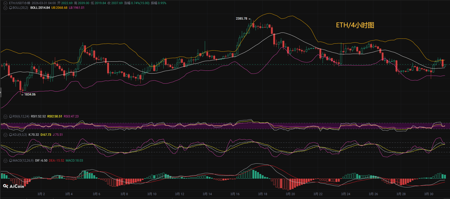 四小时MACD的DIF和DEA在零轴下方形成死叉,日线MACD的绿柱也在扩大,目前是负的34.86。均线EMA来看,价格已经跌破了所有关键的EMA均线,包括7、30、120,呈现出非常标准的一个空头排列,数值分别是2033、2041、2084。这种结构意味着反弹的阻力会比较密集,后面大家要谨防价格进一步走低。所以操作上建议,我们的思路不变,还是以反弹做啌为主,