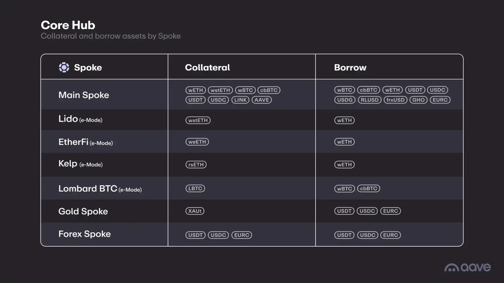 值得注意的是,每条链上并非是只有一个 Hub,而是根据不同的需求设计不同的 Hub,本质上也是一种风险的隔离。例如 V4 目前上线了 Core Hub、Prime Hub 和 Plus Hub。其中 Core Hub 包含了主流的资产并面向所有用户,Prime Hub 则为寻求更「可控」抵押品的供应商而设计。Plus Hub 则是为策略型稳定币设计,其参数设计需要考虑项目的规模。