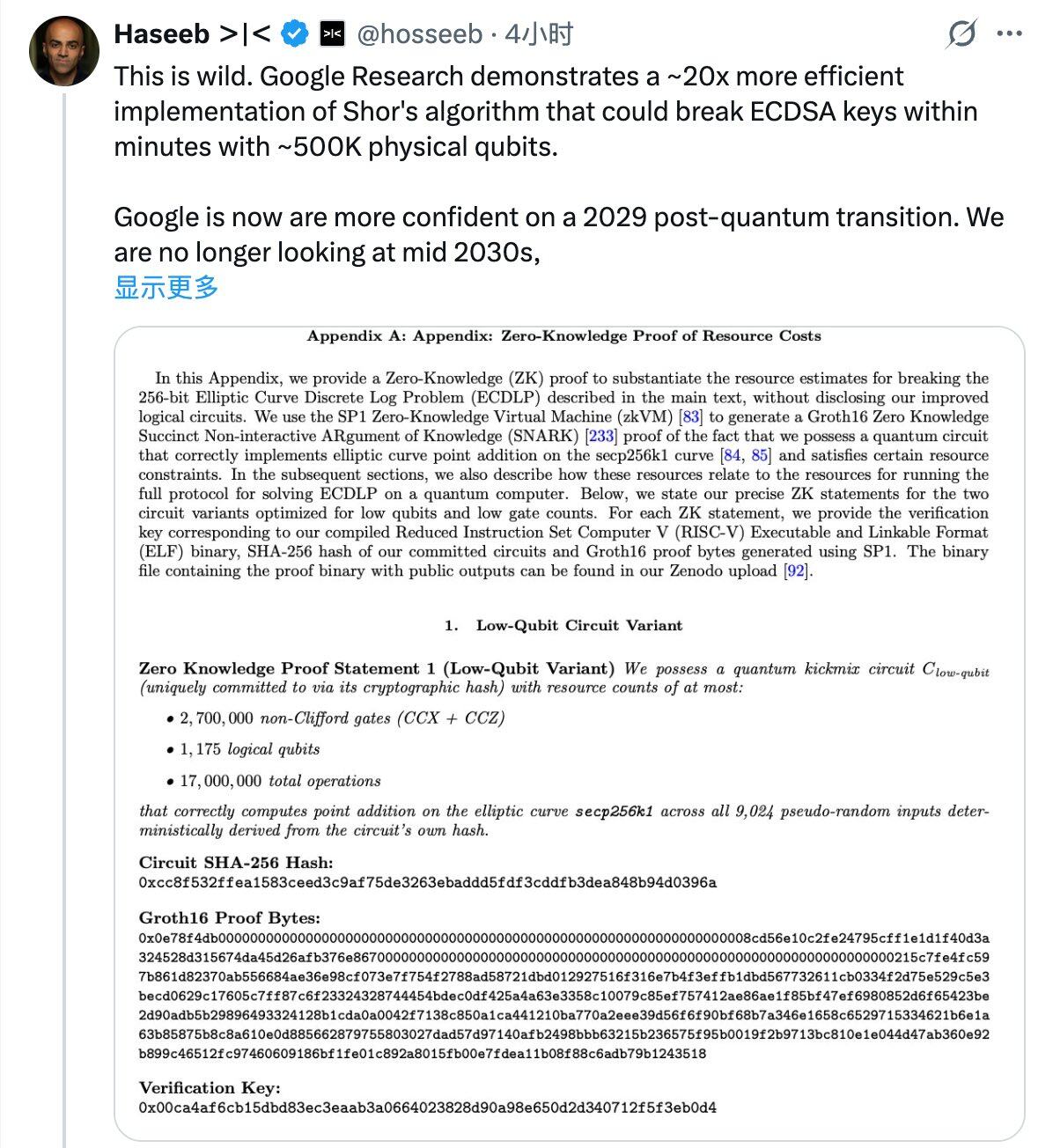 Dragonfly Capital 合伙人 Haseeb Qureshi 于 X 发文表示:“这太不可思议了……且谷歌未披露完整电路一事非常罕见,这表明谷歌认为此事非同小可。所有区块链都需要尽快制定转型计划。后量子时代不再是演习。”