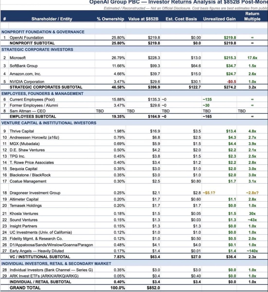 ❓ 疑似 OpenAI 股权结构表泄露,参与了利益分配的前五大股东: