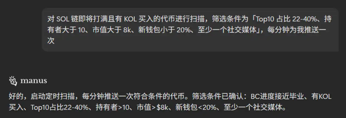 XXYY 的接口支持 28 个维度的筛选条件,可以根据新部署交易对、即将打满、已发射三个阶段设定条件。比如设定「Top10 占比 22-40%、持有者大于 10、市值大于 8k、新钱包小于 20%、至少一个社交媒体」。Agent 会 24 小时不断轮询,把符合标准的代币推送过来,不在线也能实时跟进行情。