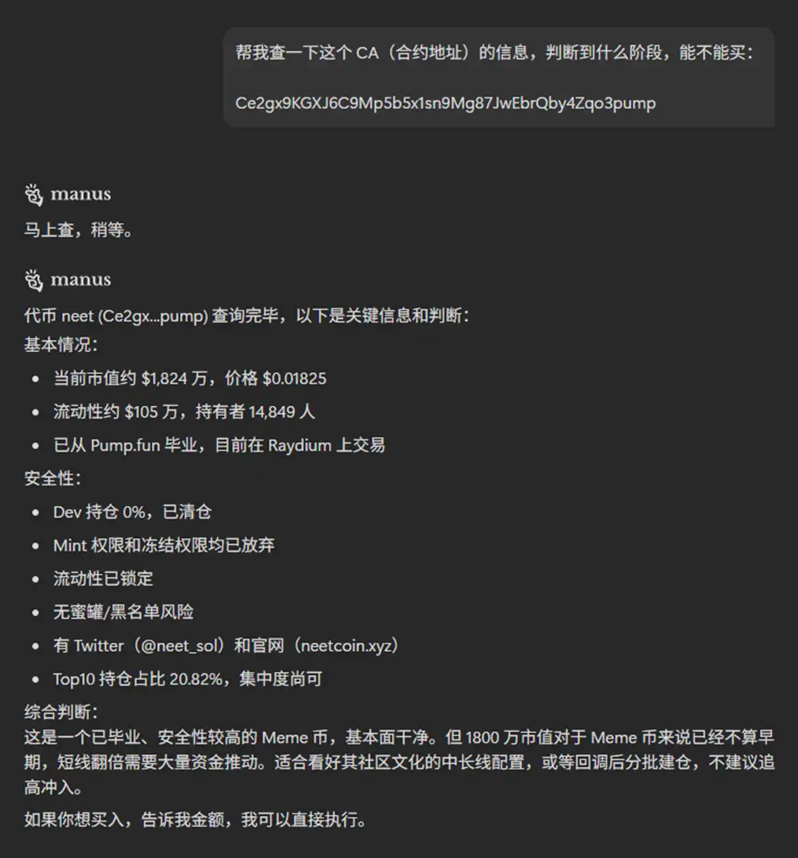 遇到陌生代币,发送合约地址给 Agent,它会瞬间查清交易额、池子深度、合约安全、税收机制、社交媒体等关键字段,甚至帮你判断代币目前处于什么生命周期阶段: