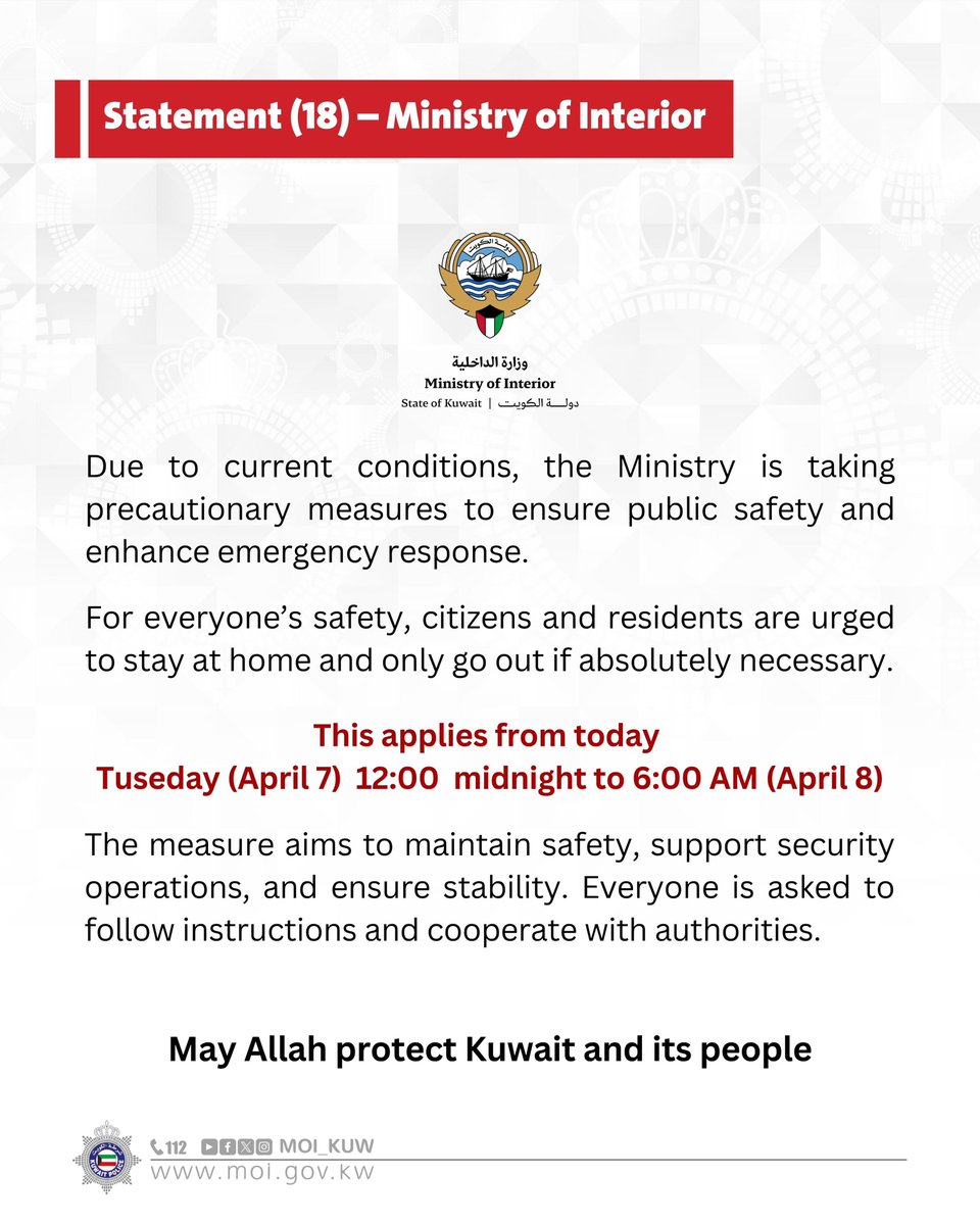 科威特内政部声明 - 关键日期非必要不出门鉴于当前国家和地区的局势